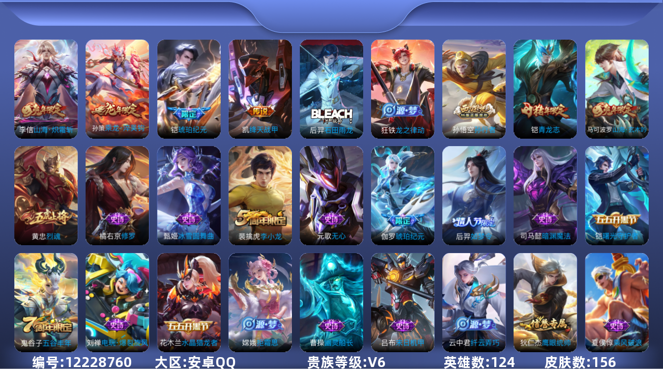 [12228760]V6 4传说 124英雄 156皮肤 可修改实名 优质装备:绛天战甲(鸡嘴战神),山海·炽霜斩(李信年限),琥珀纪元铠 传说皮:乘龙·淬吴钩(孙策年限) 珍宝阁皮:蔷薇恋人 限定皮:五谷丰年,青龙志(铠年限),烈魂,李小龙,如梦令-后羿,孙行者,山海·玄木吟(马可年限) 史诗皮:龙之律动,琥珀纪元伽罗,石田雨龙,江河有灵,百解令(蒙犽),蒙恬荣光圣徽,电玩·爆裂旋风,末日机甲-吕布,乱世虎臣,节奏热浪,修罗,水果甜心,天才门将,星夜王子,功夫厨神,暗隐猎兽者,幽灵船长,鬼剑武藏,暗渊魔法,纤云弄巧,拒霜思,乘风破浪,水晶猎龙者,曙光守护者,金属风暴,原初追逐者,圣诞狂欢,鹰眼统帅,魅力维加斯,无心,未来纪元-赵云