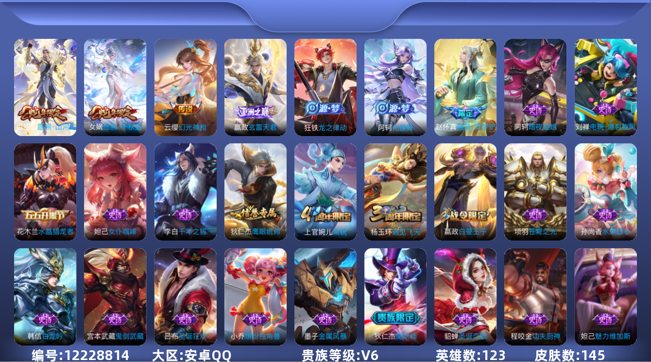 [12228814]V6 4传说 123英雄 145皮肤 可修改实名 优质装备:玄雷天君 传说皮:幻光神枪 限定皮:愿照·山河定(司空震年限),愿照·千秋盛(女娲年限),遇见飞天,梁祝,逐梦之光,美猴王 史诗皮:器灵·浮梦炉,化蝶舞,龙之律动,苍穹之光,白龙吟,千年之狐,电玩·爆裂旋风,暗夜猫娘,女仆咖啡,摇滚巨星,水果甜心,功夫厨神,鬼剑武藏,缤纷独角兽,水晶猎龙者,金属风暴,圣诞狂欢,圣诞恋歌,鹰眼统帅,魅力维加斯,奇遇舞章