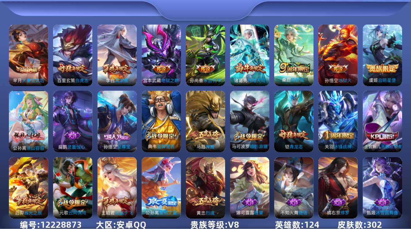 [12228873]V8 1典藏 8传说 124英雄 302皮肤 可修改实名 优质装备:大秦宣太后,末日机甲-孙尚香(绿蚂蚱),地狱火,地狱之眼,涂山容容 珍宝阁皮:胡桃夹子,优雅恋人 限定皮:鸣野蒿,至尊宝,白虎志(电光耗子),凤求凰(白切鸡),凤凰于飞,魔法小厨娘,时雨天司(水龙头),神威(电光马子),遇见飞天,五谷丰年,青龙志(铠年限),冰锋战神,梁祝,烈魂,逐梦之音,天狼绘梦者,李小龙,逐梦之光,辉光之辰,蜜橘之夏 史诗皮:灵蛊蚀心,星界战将,紫霞仙子,电玩小子(小书包),白龙吟,黄金分割率,特工魅影,千年之狐,魅语,偶像歌手,晚萤,电玩·爆裂旋风,暗夜猫娘,龙骑士(小龙虾),末日机甲-吕布,猫狗日记-孙策,猫狗日记-大乔,乱世虎臣,节奏热浪,修罗,女仆咖啡,摇滚巨星,水果甜心,绅士熊喵,天才门将,星夜王子,心灵骇客,功夫厨神,德古拉伯爵,暗隐猎兽者,幽灵船长,鬼剑武藏,心灵战警,舞动绿茵,地狱岩魂,纤云弄巧,繁星吟游(呼啦呼啦),缤纷独角兽,乘风破浪,逐浪之夏,水晶猎龙者,曙光守护者,箭羽风息,金属风暴,原初追逐者,圣诞狂欢,圣诞恋歌,鹰眼统帅,暗夜贵公子,魅力维加斯,黎明之约,奇遇舞章,无心,未来纪元-赵云