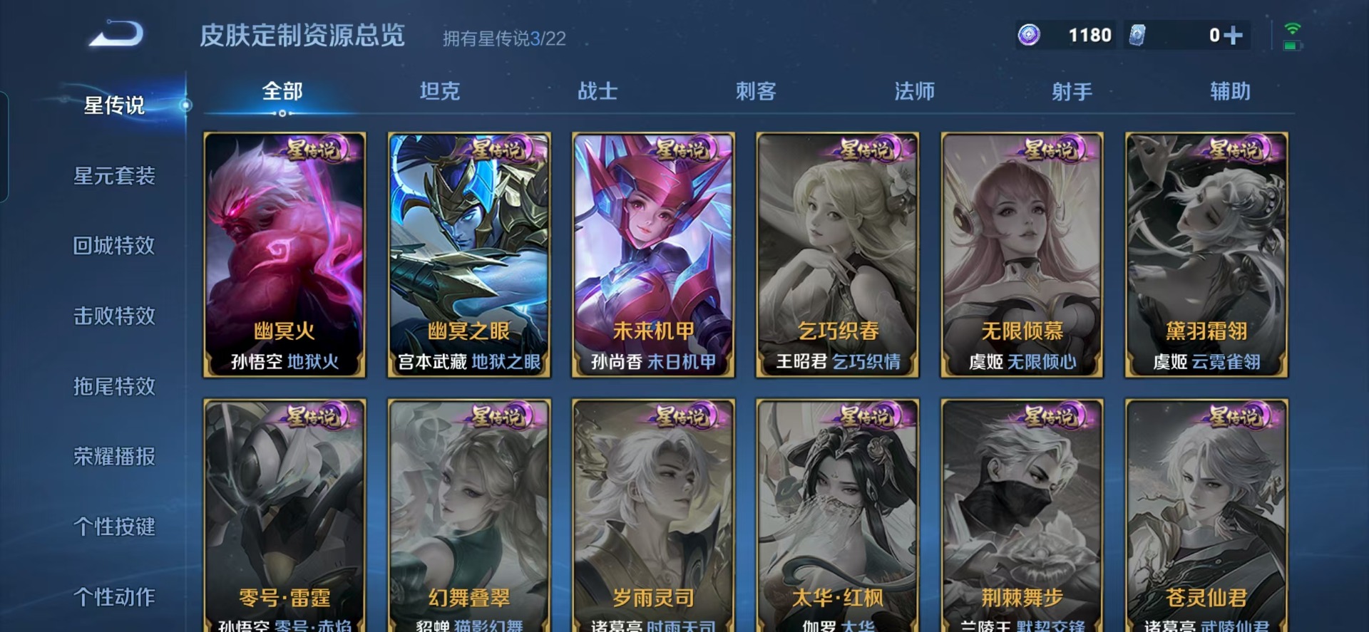 - PX_2073460-贵族等级: V10 英雄数: 125 皮肤数: 215 荣耀水晶: 武则天,杀手不太冷,全息碎影 星传说: 幻海之心,未来机甲,幽冥之眼,金色仲夏夜 传说皮: 黄金狮子座,黄金射手座,黄金白羊座,猫影幻舞,久胜战神,云霓雀翎,末日机甲-孙尚香,地狱火,仲夏夜之梦,海洋之心,地狱之眼,胖达荣荣,超时空战士-狄仁杰,艾琳觅芳踪 限定皮: 李小龙,梁祝,魔法小厨娘,玄嵩,岱宗,幽恒