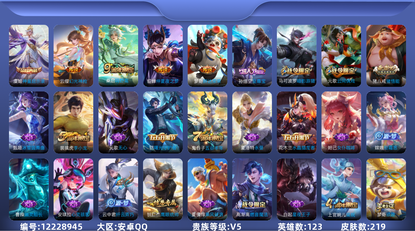 - [11853756]V7 1典藏 9传说 123英雄 253皮肤 可修改实名 优质装备:弑枪猎影(韩信典藏),云霓雀翎,末日机甲-孙尚香(绿蚂蚱),音你心动-周瑜,乞巧织情,淬星耀世,超时空战士-狄仁杰,山海·苍雷引(电光曜子) 珍宝阁皮:妄想食味,优雅恋人 限定皮:鸣野蒿,高山流水,诗剑行,五谷丰年,梁祝,朱雀志(守约年限),孙行者,猪悟能 史诗皮:星界战将,破空之剑,蒙犽顽岩魄,琥珀纪元伽罗,蔬乡物语(鲁班七号),百相守梦-百里守约,紫霞仙子,苍穹之光,电玩小子(小书包),特工魅影,千年之狐,江河有灵,雪夜绮愿(周瑜),魅语,百解令(蒙犽),高渐离燃音魔法,蒙恬荣光圣徽,无限星赏官,冰冠公主,青蛇,偶像歌手,白蛇,晚萤,电玩·爆裂旋风,末日机甲-吕布,猫狗日记-孙策,猫狗日记-大乔,乱世虎臣,节奏热浪,女仆咖啡,摇滚巨星,水果甜心,绅士熊喵,天才门将,星夜王子,心灵骇客,功夫厨神,德古拉伯爵,暗隐猎兽者,幽灵船长,鬼剑武藏,心灵战警,天秀·启明,舞动绿茵,地狱岩魂,纤云弄巧,拒霜思,缤纷独角兽,乘风破浪,逐浪之夏,月团寄思,水晶猎龙者,曙光守护者,箭羽风息,金属风暴,原初追逐者,圣诞狂欢,圣诞恋歌,鹰眼统帅,暗夜贵公子,魅力维加斯,黎明之约,无心,未来纪元-赵云