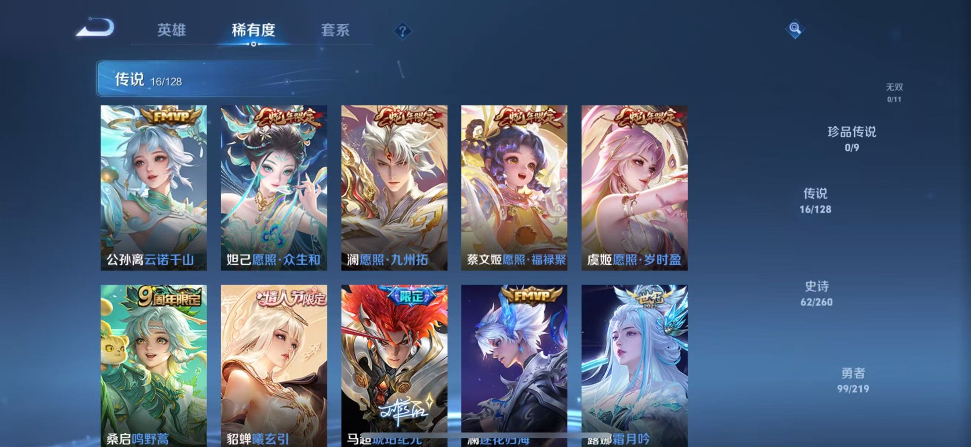 公孙离玉兔公主,貂蝉逐梦之音,裴擒虎李小龙,马可波罗逐梦之星,马可波罗山海·玄木吟,艾琳陌上桑,桑启鸣野蒿,妲己愿照·众生和,百里守约朱雀志,蔡文姬愿照·福禄聚,澜愿照·九州拓,虞姬愿照·岁时盈