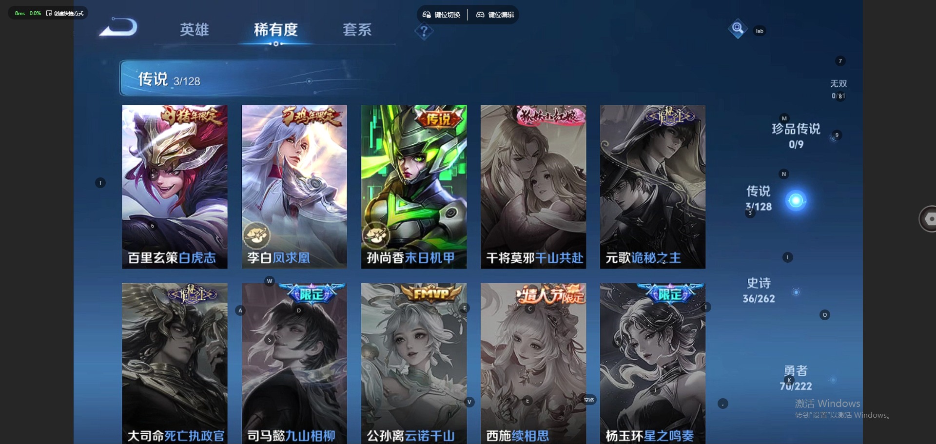 - [11676225]V8 1典藏 1珍品传说 18传说 124英雄 313皮肤 可修改实名 优质装备:弑枪猎影(韩信典藏),器灵·落星盏,黄金狮子座,炽阳神光,一念神魔,末日机甲-孙尚香(绿蚂蚱),地狱之眼,音你心动-周瑜,无双飞将,山海·炽霜斩(李信年限),山海·苍雷引(电光曜子),浮生妄,霜月吟 传说皮:落雪白狼 珍宝阁皮:妄想食味,优雅恋人,蔷薇恋人 限定皮:愿照·九州拓(澜年限),鸣野蒿,至尊宝,傲雪梅枪,时雨天司(水龙头),神威(电光马子),高山流水,怒海麟威,五谷丰年,冰锋战神,龙胆,祈雪灵祝(雪兔子),朱雀志(守约年限),青春决赛季,蜜橘之夏,唐三藏,山海·玄木吟(马可年限) 史诗皮:星界战将,龙之律动,雪豹·霜爪,茶境仙,东方月初,蒙犽顽岩魄,蔬乡物语(鲁班七号),紫霞仙子,苍穹之光,电玩小子(小书包),黄金分割率,特工魅影,永昼,匿光破解者,百相守梦(刘备),电玩·爆裂旋风,真我赫兹(镜),真我赫兹(百里守约),江河有灵,百解令(蒙犽),高渐离燃音魔法,蒙恬荣光圣徽,偶像歌手,魅语,晚萤,冰冠公主,末日机甲-吕布,猫狗日记-孙策,猫狗日记-大乔,乱世虎臣,节奏热浪,女仆咖啡,摇滚巨星,水果甜心,绅士熊喵,天才门将,星夜王子,心灵骇客,功夫厨神,德古拉伯爵,暗隐猎兽者,幽灵船长,鬼剑武藏,暗渊魔法,舞动绿茵,地狱岩魂,缤纷独角兽,乘风破浪,逐浪之夏,月团寄思,水晶猎龙者,曙光守护者,箭羽风息,金属风暴,原初追逐者,圣诞恋歌,鹰眼统帅,魅力维加斯,黎明之约,雪上飞焰,赏金猎手,奇遇舞章,无心
