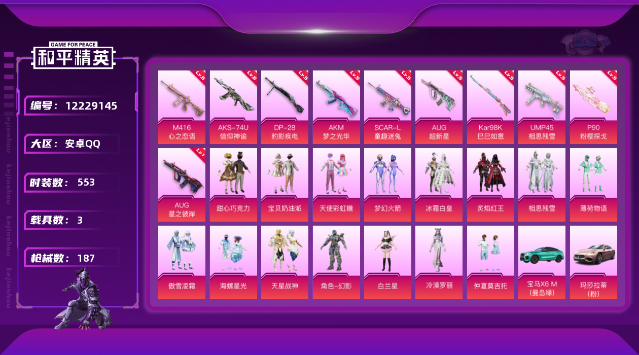 [12229145]15粉装 10特效枪 3载具 11印记 可二次 可修改实名 身法装备:都市猎人,暗影哥特(红眼罩),萌熊伴侣背包(粉熊背包) 优质装备:宝马X6 M(曼岛绿),玛莎拉蒂Ghibli(粉),甜心巧克力,宾利BATUR(极速紫),都市猎人,萌熊伴侣背包(粉熊背包),M416心之恋语,梦幻火箭(新101)(新火箭少女101粉色套装),宝贝奶油派,天使彩虹糖,SCAR-L童趣迷兔,炙焰红王,冰霜白皇,AUG星之彼岸,UMP45相思残雪(UMP45-相思残雪),相思残雪,AKM梦之光华,P90粉樱探戈,AUG超新星,AKS-74U-信仰神谕,冷漠罗丽,Kar98K-巳巳如意 热门装扮:薄荷物语,傲雪凌霜,海螺星光,仲夏莫吉托,天星战神,幻影,白兰星,兔兔白日梦,胖达圆圆,胖达团团,罗小黑,鹰眼刺客,万圣娃娃,都市猎人 稀有枪皮:DP-28-豹影疾电 六级特效枪:六级M416-心之恋语,六级AKS-74U-信仰神谕 五级特效枪:五级SCAR-L-童趣迷兔,五级Kar98K-巳巳如意,五级DP-28-豹影疾电,五级P90-粉樱探戈,五级AUG-超新星,五级UMP45-相思残雪,五级AKM-梦之光华 一级特效枪:一级AUG-星之彼岸 紫色装扮:田园牧歌,轻风白浪,和煦暖阳,SS22特训,SS23特训,幻彩翩翩,妙红点点,摩登艾咪,香榭午后,娇憨猪猪,梦幻奶油,萌趣咩咩,SS21特训,SS31特训套装,冷焰舞者,SS30特训套装,云朵鹅,彩虹兔,雪绒豹,SS33特训套装,青涩时光,顶瓜瓜,时希公主,SS20特训,星梦畅游,微雨春柳,暖风夏荷,猎梦纪元,飞驰魅影,音速流光,SS19特训,甜心亚梦,虚音幻奏,野性山猫,野性战心,长空猛禽,霓虹街区,青年教官,缤纷果语,街头潮人,飞行日记,魅力单车,麻辣教官,黄色名流,黑色伏地魔,龙的传人,龟仙人,香桃花海,沙漠毒蛇,极地朋克,柠萌假日,海岛探路者,涂山之恋,坚韧舞者,夏日倾情,完美偶像,帅气教官,幻世战舞者,探宝勇士,湖蓝色名流,白熊同盟,白色伏地魔,破晓战魂,破蛋小黄鸡,空岛之星,竞技达人朋克,甜蜜熊情侣,王牌教练,牛气冲天,炫蓝之夏,牛气满满,猛禽,猎鹰,SS29特训,星途旅人,SS28特训,异域银装,鱼渊荷华,玉兔迎春,燕燕于飞,巳巳如意,海琴烟,风玲,青团波波,糖糖葫芦,棉花软糖,竞技名士,摩登魅猫,暗影哥特(红眼罩),街头风暴