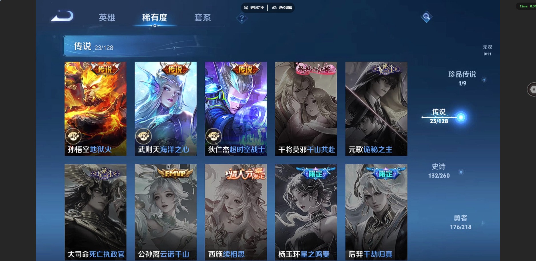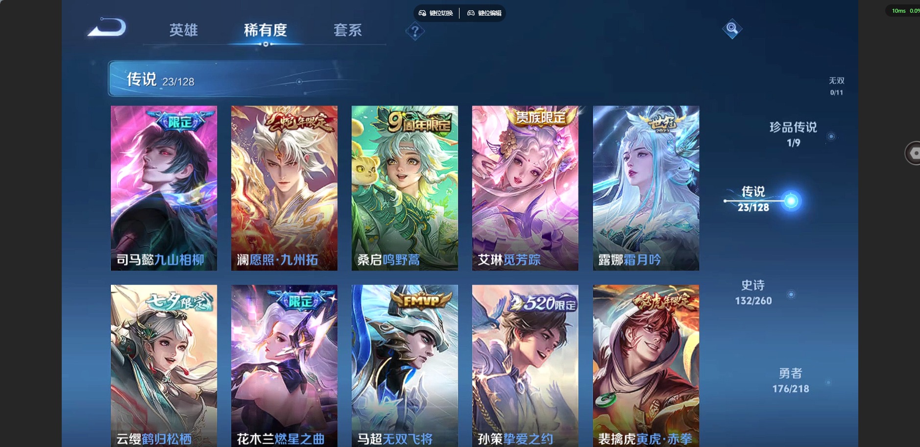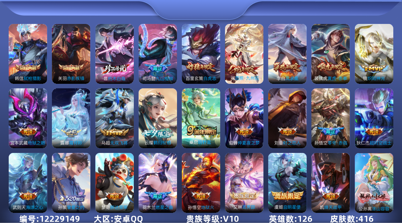 [12229149]V10 2典藏 1珍品传说 23传说 126英雄 416皮肤 典藏英雄武则天 阿轲小国标 梦奇小国标 可修改实名 优质装备:赤影疾锋,弑枪猎影(韩信典藏),朽木白哉,绛天战甲(鸡嘴战神),炽阳神光,地狱火,仲夏夜之梦(大飞蛾),零号·赤焰,海洋之心,地狱之眼,胖达荣荣,时之恋人-刘备(电焊工),超时空战士-狄仁杰,挚爱之约,无双飞将,燃星之曲,鹤归松栖(云缨),霜月吟,艾琳觅芳踪,涂山容容 传说皮:九山相柳 珍宝阁皮:万物之道,优雅恋人 限定皮:愿照·九州拓(澜年限),鸣野蒿,至尊宝,白虎志(电光耗子),凤求凰(白切鸡),凤凰于飞,傲雪梅枪,白晶晶,飞衡(韩信年限),玄嵩(庄周年限),遇见飞天,高山流水,五谷丰年,冰锋战神,游园惊梦,梁祝,逐梦之星,烈魂,岱宗(典韦年限),李小龙,逐梦之光,如梦令-嫦娥,如梦令-后羿,霸王别姬-虞姬,奇迹圣诞,纯白花嫁,孙行者,大圣娶亲,引擎之心,冰霜恋舞曲,热情桑巴,美猴王,寅虎·赤拳(老虎年限),百木心枪,玉兔公主,山海·玄木吟(马可年限) 史诗皮:化蝶舞,灵蛊蚀心,星界战将,龙之律动,石田雨龙,百相守梦-周瑜,东方月初,超元猎域,百相守梦-黄忠,守夜人,紫霞仙子,电玩小子(小书包),白龙吟,黄金分割率,特工魅影,千年之狐,江河有灵,鹤归松栖(赵怀真),真我赫兹(镜),魅语,百解令(蒙犽),高渐离燃音魔法,蒙恬荣光圣徽,无限星赏官,冰冠公主,偶像歌手,白蛇,晚萤,电玩·爆裂旋风,暗夜猫娘,龙骑士(小龙虾),末日机甲-吕布,猫狗日记-孙策,猫狗日记-大乔,时之恋人-孙尚香,乱世虎臣,节奏热浪,修罗,女仆咖啡,摇滚巨星,水果甜心,绅士熊喵,天才门将,星夜王子,心灵骇客,时之奇旅-安琪拉,功夫厨神,德古拉伯爵,暗隐猎兽者,幽灵船长,鬼剑武藏,暗渊魔法,心灵战警,乐园奇幻夜,天秀·启明,舞动绿茵,地狱岩魂,诗语江南,纤云弄巧,拒霜思,缤纷独角兽,乘风破浪,逐浪之夏,月团寄思,水晶猎龙者,曙光守护者,热力回旋,箭羽风息,金属风暴,原初追逐者,圣诞狂欢,圣诞恋歌,鹰眼统帅,王者之锤,暗夜贵公子,魅力维加斯,黎明之约,雪上飞焰,千筹问战,无心,未来纪元-赵云
