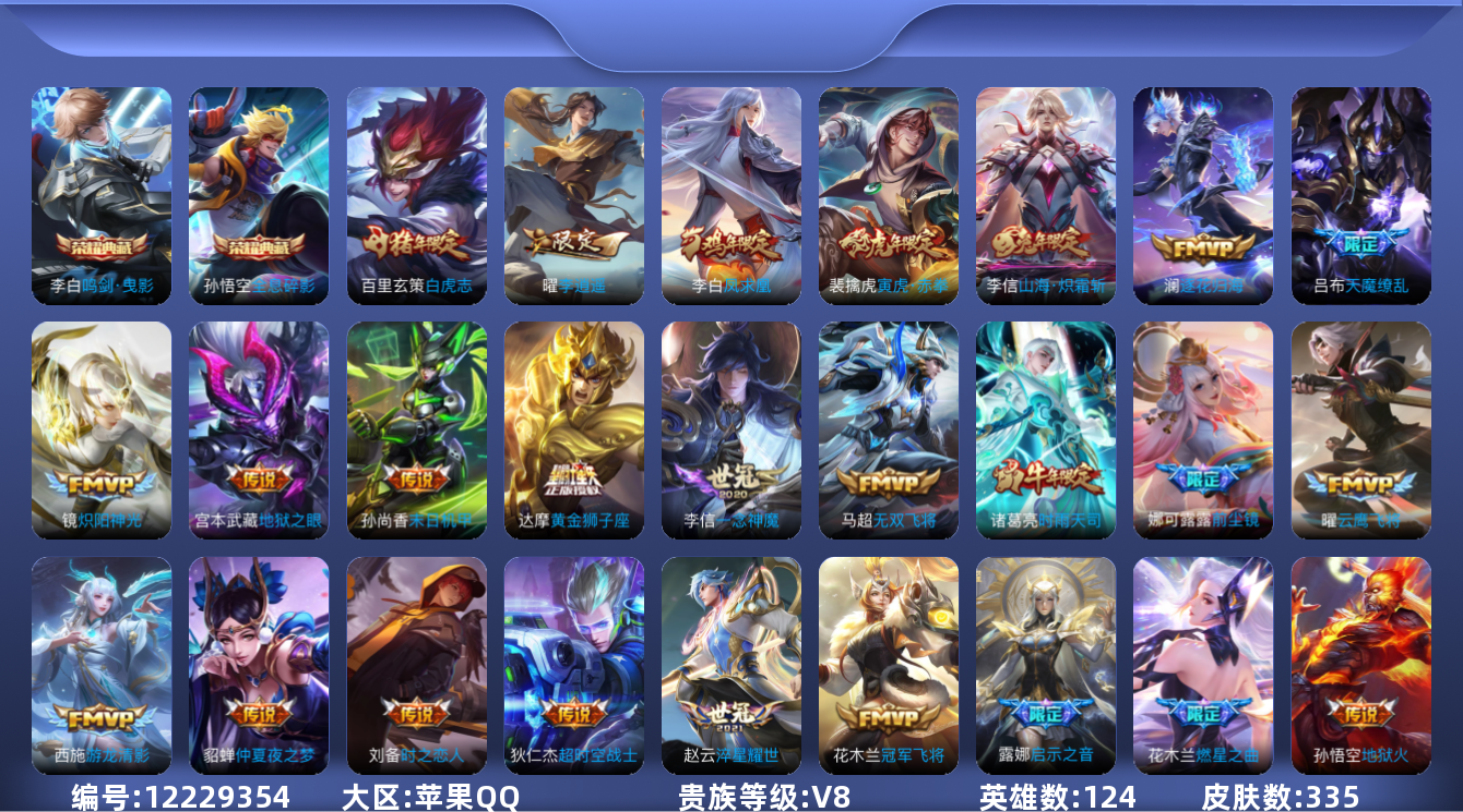 [12229354]V8 2典藏 26传说 124英雄 335皮肤 可修改实名 女号 优质装备:鸣剑·曳影,全息碎影(猴子典藏),黄金狮子座,冠军飞将,云鹰飞将(小将军),炽阳神光,一念神魔,末日机甲-孙尚香(绿蚂蚱),地狱火,仲夏夜之梦(大飞蛾),地狱之眼,李逍遥,时之恋人-刘备(电焊工),游龙清影(小青龙),淬星耀世,超时空战士-狄仁杰,无双飞将,山海·炽霜斩(李信年限),燃星之曲,澜逐花归海 珍宝阁皮:优雅恋人,蔷薇恋人,女武神 限定皮:至尊宝,白虎志(电光耗子),凤求凰(白切鸡),梅西,傲雪梅枪,前尘镜,时雨天司(水龙头),神威(电光马子),飞衡(韩信年限),遇见飞天,高山流水,五谷丰年,游园惊梦,梁祝,李小龙,逐梦之影,朱雀志(守约年限),纯白花嫁,孙行者,猪悟能,大圣娶亲,天魔缭乱,寅虎·赤拳(老虎年限),玉兔公主,启示之音,山海·玄木吟(马可年限) 史诗皮:紫霞仙子,苍穹之光,电玩小子(小书包),白龙吟,黄金分割率,特工魅影,千年之狐,江河有灵,魅语,百解令(蒙犽),蒙恬荣光圣徽,冰冠公主,偶像歌手,晚萤,电玩·爆裂旋风,龙骑士(小龙虾),末日机甲-吕布,猫狗日记-孙策,猫狗日记-大乔,乱世虎臣,节奏热浪,修罗,女仆咖啡,摇滚巨星,水果甜心,绅士熊喵,天才门将,星夜王子,心灵骇客,功夫厨神,德古拉伯爵,暗隐猎兽者,幽灵船长,鬼剑武藏,暗渊魔法,心灵战警,舞动绿茵,地狱岩魂,诗语江南,纤云弄巧,繁星吟游(呼啦呼啦),拒霜思,缤纷独角兽,乘风破浪,逐浪之夏,龙鼓争鸣,水晶猎龙者,曙光守护者,热力回旋,箭羽风息,金属风暴,原初追逐者,圣诞狂欢,圣诞恋歌,鹰眼统帅,暗夜贵公子,魅力维加斯,黎明之约,赏金猎手,无心,未来纪元-赵云
