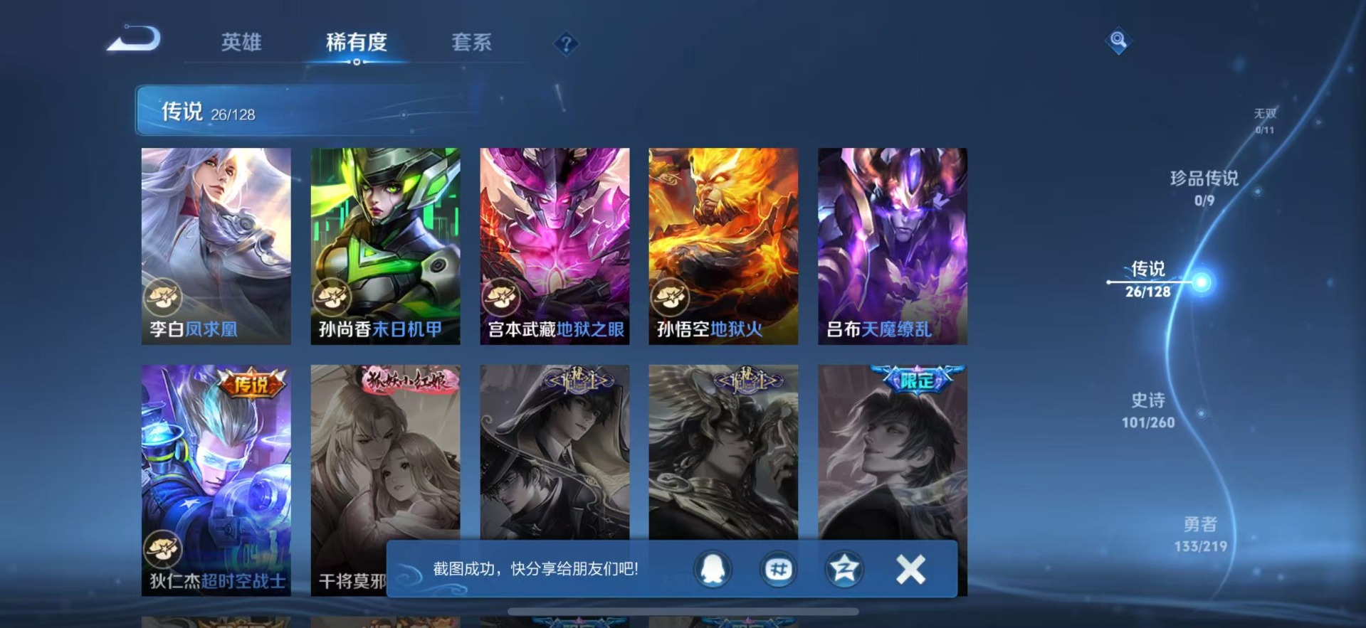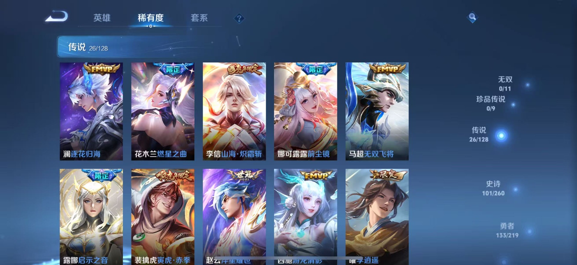 - PX_2108135-Q/永恒钻石/194皮肤/123英雄/1典藏/0珍品无双/0无双/1珍品传说/8传说/45史诗/7稀有英雄 【1 珍品传说】兔狲·蓬尾 张飞, 【1 典藏皮肤】九霄神辉 花木兰, 【8 传说皮肤】启明星使 虞姬,前尘镜 娜可露露,零号·赤焰 孙悟空,地狱火 孙悟空,海洋之心 武则天,霜月吟 露娜,一念神魔 李信,淬星耀世 赵云, 【45 史诗皮肤】电玩小子 鲁班七号,紫霞仙子
