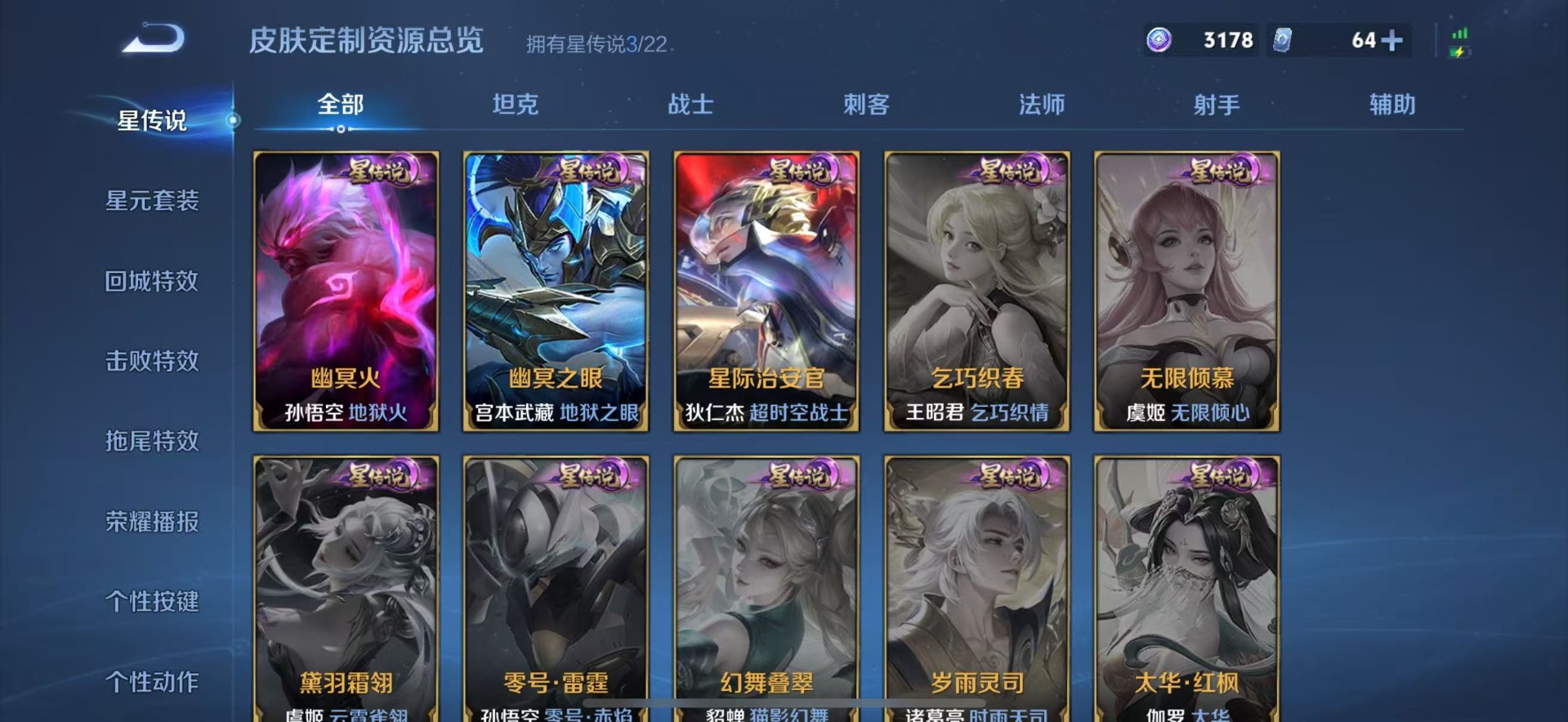 夏侯惇朔风刀,老夫子醍醐杖,沈梦溪星空之诺,沈梦溪大漠名商,盾山御銮,曹操烛龙,苏烈千军破阵,典韦穷奇,典韦蓝屏警告,达摩沙漠行僧,牛魔御旌,鲁班七号狮舞东方,吕布猎兽之王,元歌云间偶戏,兰陵王金庭之子,裴擒虎擒涛扼浪,鲁班大师探海日志,明世隐疑决卦,蒙犽狂想玩偶喵,马可波罗暗影游猎,白起狰,鬼谷子原初探秘者,张良古海寻踪,女娲朔望之晖,桑启海盐诗旅,狄仁杰万华元夜,嬴政白昼王子,芈月重明,程咬金演武夺筹,扁鹊炼金王,李元芳银河之约,李元芳云中旅人,弈星混沌棋,虞姬凯尔特女王,米莱狄御霄,钟馗神迹守卫,钟馗驱傩正仪,狂铁御狮,太乙真人饕餮