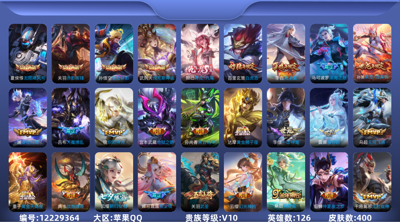 [12229364]V10 4典藏 1无双 36传说 126英雄 400皮肤 典藏英雄武则天 可修改实名 女号 优质装备:倪克斯神谕(宇宙婆娘),无限飓风号(高达),全息碎影(猴子典藏),赤影疾锋,青丘·九尾(妲己无双),黄金狮子座,黄金射手座,冠军飞将,黄金白羊座,猫影幻舞,久胜战神,炽阳神光,一念神魔,末日机甲-孙尚香(绿蚂蚱),地狱火,仲夏夜之梦(大飞蛾),海洋之心,地狱之眼,音你心动-周瑜,乞巧织情,超时空战士-狄仁杰,无双飞将,青丘·九尾,鹤归松栖(云缨),霜月吟,澜逐花归海,艾琳觅芳踪,黄金天蝎座,玄雷天君,涂山容容 传说皮:乘龙·淬吴钩(孙策年限),典韦战鼓燎原,幻光神枪 珍宝阁皮:妄想食味,胡桃夹子 限定皮:逐霄战戟,鸣野蒿,白虎志(电光耗子),凤求凰(白切鸡),傲雪梅枪,前尘镜,神威(电光马子),遇见飞天,高山流水,诗剑行,五谷丰年,冰锋战神,武圣,游园惊梦,梁祝,天狼绘梦者,李小龙,猪悟能,一生所爱,大圣娶亲,引擎之心,天魔缭乱,冰霜恋舞曲,云端筑梦师,蜜橘之夏,匿光追影者,百木心枪,深海之息(深海大菠萝),枫霜尽 史诗皮:飞车小橘子,器灵·浮梦炉,糖绘人间,化蝶舞,灵蛊蚀心,龙之律动,茶境仙,怒海争锋,破空之剑,战舞者,蔬乡物语(鲁班七号),百相守梦-百里守约,紫霞仙子,苍穹之光,电玩小子(小书包),黄金分割率,特工魅影,千年之狐,永昼,江河有灵,匿光侦查者,末日机甲-莱西奥,鹤归松栖(赵怀真),真我赫兹(百里守约),闲日渔趣,魅语,百解令(蒙犽),高渐离燃音魔法,冰冠公主,暗夜猫娘,银翎春语,龙骑士(小龙虾),末日机甲-吕布,猫狗日记-孙策,猫狗日记-大乔,乱世虎臣,节奏热浪,女仆咖啡,摇滚巨星,水果甜心,绅士熊喵,天才门将,星夜王子,心灵骇客,时之奇旅-安琪拉,功夫厨神,德古拉伯爵,暗隐猎兽者,幽灵船长,鬼剑武藏,暗渊魔法,心灵战警,乐园奇幻夜,天秀·启明,舞动绿茵,地狱岩魂,纤云弄巧,繁星吟游(呼啦呼啦),拒霜思,缤纷独角兽,乘风破浪,逐浪之夏,月团寄思,水晶猎龙者,曙光守护者,箭羽风息,金属风暴,圣诞狂欢,圣诞恋歌,鹰眼统帅,暗夜贵公子,魅力维加斯,天秀·音浪,无心,未来纪元-赵云