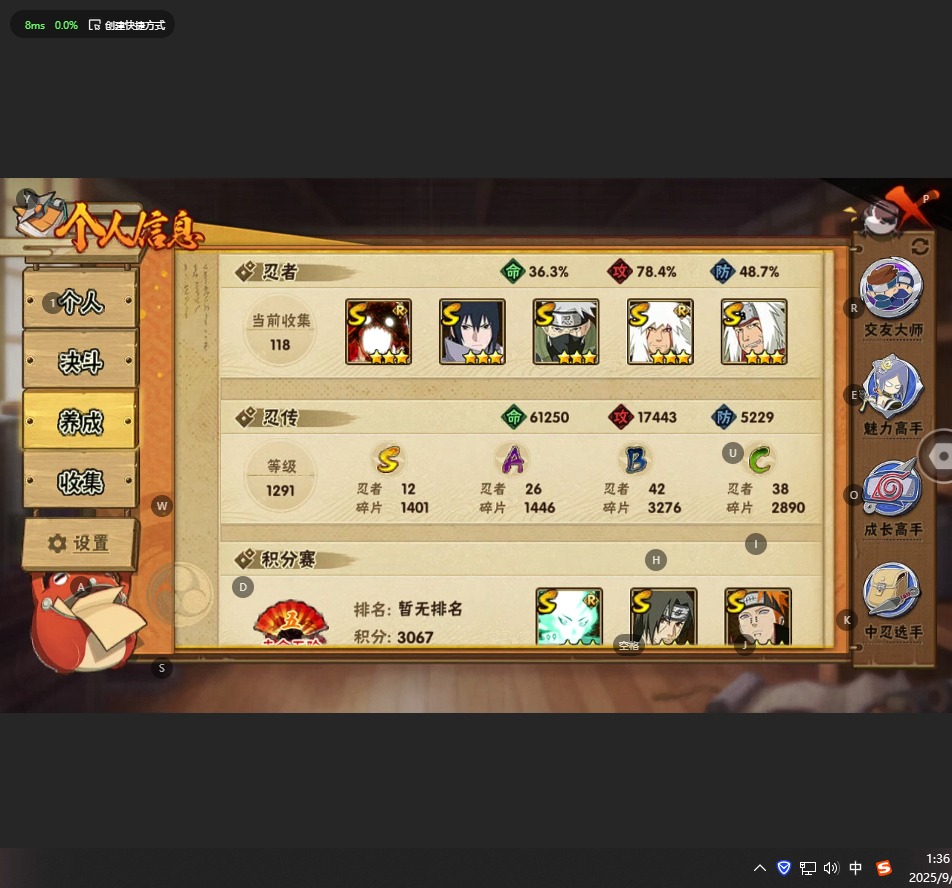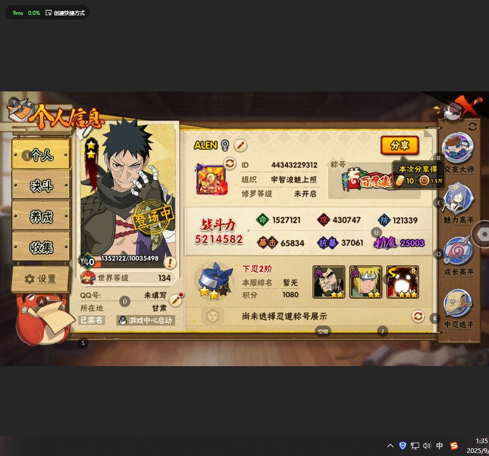 [12229479]V11 12S忍 26A忍 13通灵 521.4W战力 可二次 可修改实名 优质装备:神秘面具男 「红夜之刃」,宇智波佐助「永恒万花筒」,艾「忍界大战」,宇智波止水「须佐能乎」,旗木卡卡西「须佐能乎」,大筒木舍人 「最终章」,自来也 「传说中的三忍」,漩涡鸣人 「暴怒·第六尾」 S级忍者:自来也 「舞之豪杰」,宇智波鼬 「须佐能乎」,佩恩「天道」,波风水门