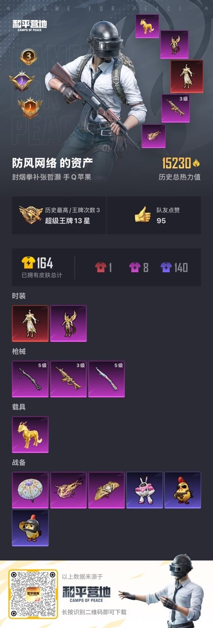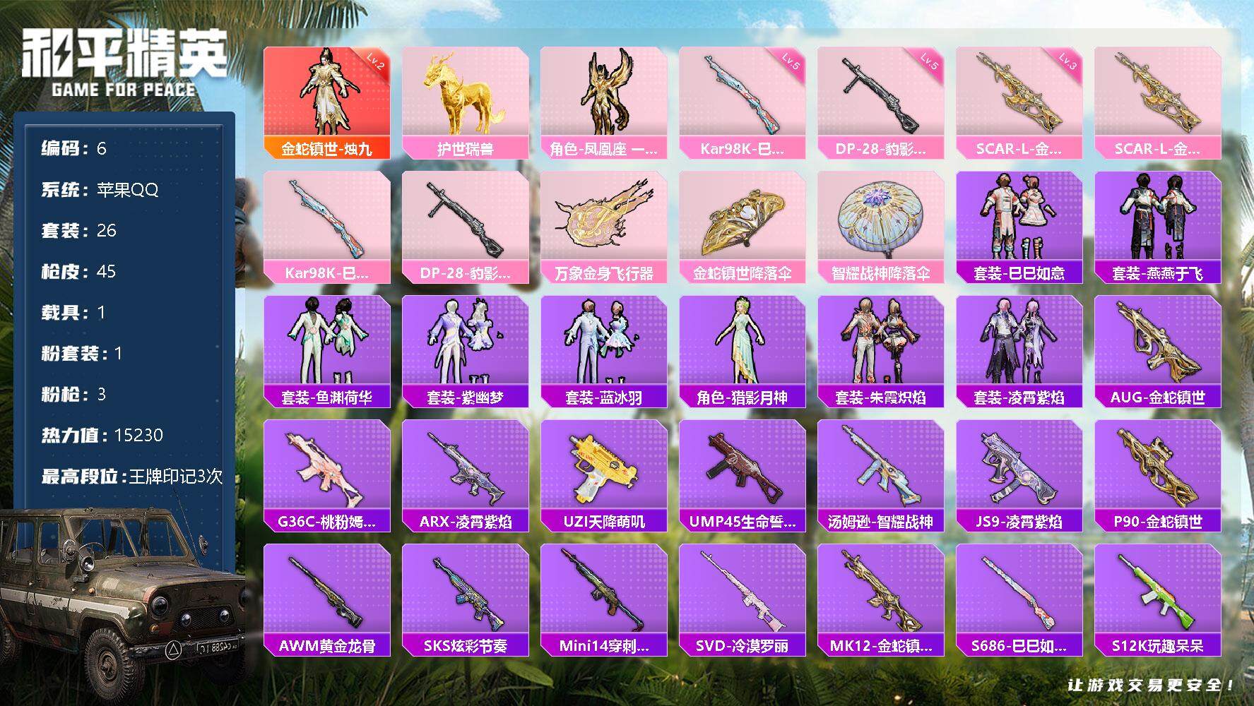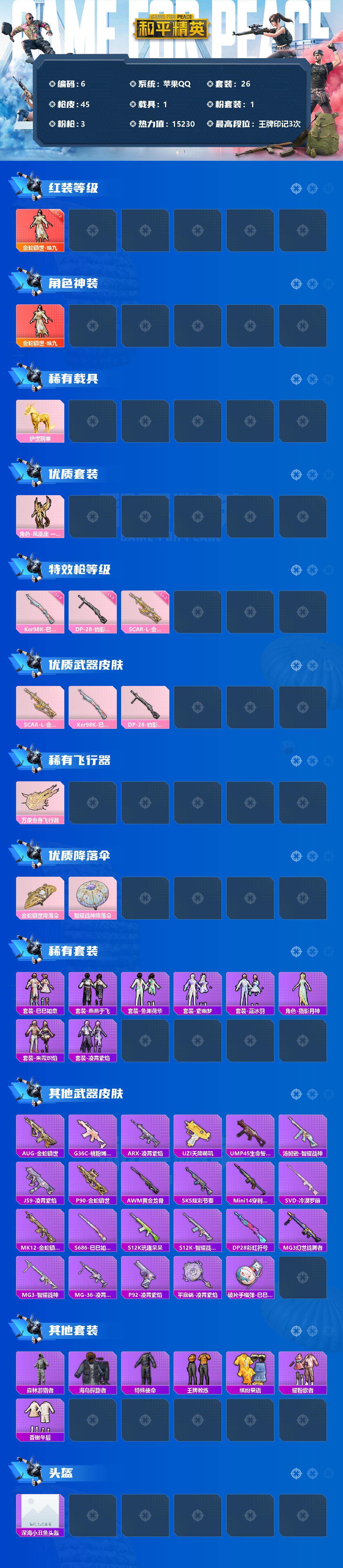 [12229871]【商品标题】:苹果 手Q-1神装-1粉装-3特效枪-1载具-1粉色飞行器-15230热力值-3王牌印记-26套装-45枪皮