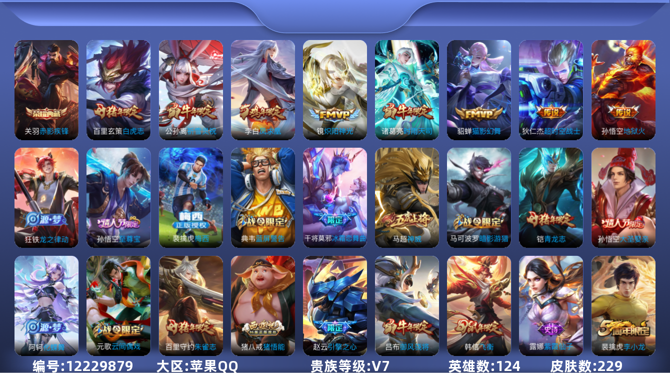 [12229879]V7 1典藏 8传说 124英雄 229皮肤 可修改实名 优质装备:赤影疾锋,猫影幻舞,炽阳神光,地狱火,超时空战士-狄仁杰 珍宝阁皮:蔷薇恋人 限定皮:至尊宝,白虎志(电光耗子),凤求凰(白切鸡),梅西,时雨天司(水龙头),神威(电光马子),飞衡(韩信年限),高山流水,青龙志(铠年限),梁祝,御风骁将(吕布年限),祈雪灵祝(雪兔子),李小龙,朱雀志(守约年限),如梦令-后羿,猪悟能,大圣娶亲,引擎之心,冰霜恋舞曲,匿光追影者 史诗皮:化蝶舞,龙之律动,茶境仙,紫霞仙子,苍穹之光,白龙吟,黄金分割率,特工魅影,千年之狐,偶像歌手,龙骑士(小龙虾),暗夜猫娘,乱世虎臣,女仆咖啡,水果甜心,绅士熊喵,心灵骇客,德古拉伯爵,暗隐猎兽者,幽灵船长,鬼剑武藏,暗渊魔法,舞动绿茵,纤云弄巧,繁星吟游(呼啦呼啦),拒霜思,缤纷独角兽,乘风破浪,逐浪之夏,水晶猎龙者,金属风暴,原初追逐者,圣诞狂欢,鹰眼统帅,黎明之约,雪上飞焰