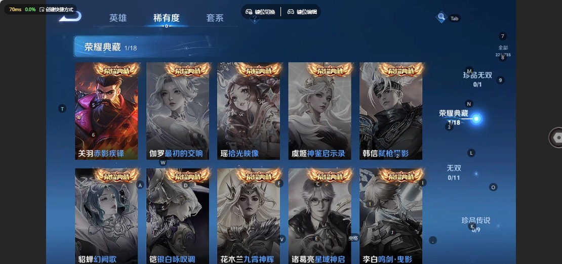 - PX_2099944-74 安卓QQ/至尊星耀/399皮肤/124英雄/4典藏/1珍品无双/2无双/4珍品传说/28传说/133史诗/8稀有英雄 【1 珍品无双】馥梦繁花, 【4 珍品传说】大耳狗之梦 瑶,朽木白哉 暃,怪盗基德 马可波罗,时之奇旅 孙策, 【4 典藏皮肤】鸣剑·曳影 李白,银白咏叹调 铠,幻阙歌 貂蝉,九霄神辉 花木兰, 【2 无双皮肤】碎月剑心 李白,离恨烟 公孙离, 【28