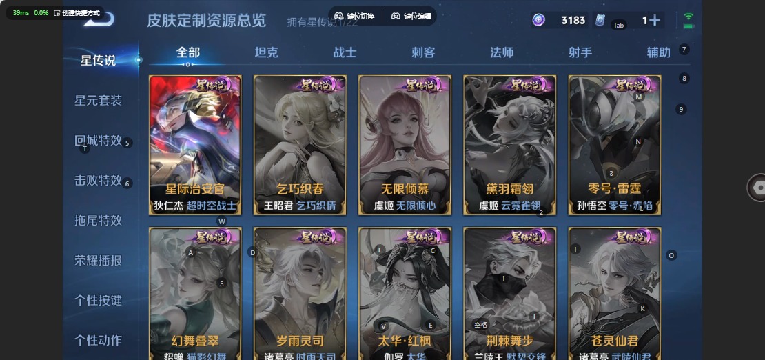 铠青龙志,干将莫邪冰霜恋舞曲,吕布御风骁将,后羿如梦令,镜匿光追影者,诸葛亮时雨天司,公孙离祈雪灵祝,裴擒虎梅西,裴擒虎李小龙,上官婉儿梁祝,猪八戒猪悟能,孙悟空大圣娶亲,孙悟空至尊宝,百里玄策白虎志,马超神威,赵云引擎之心,韩信飞衡,百里守约朱雀志