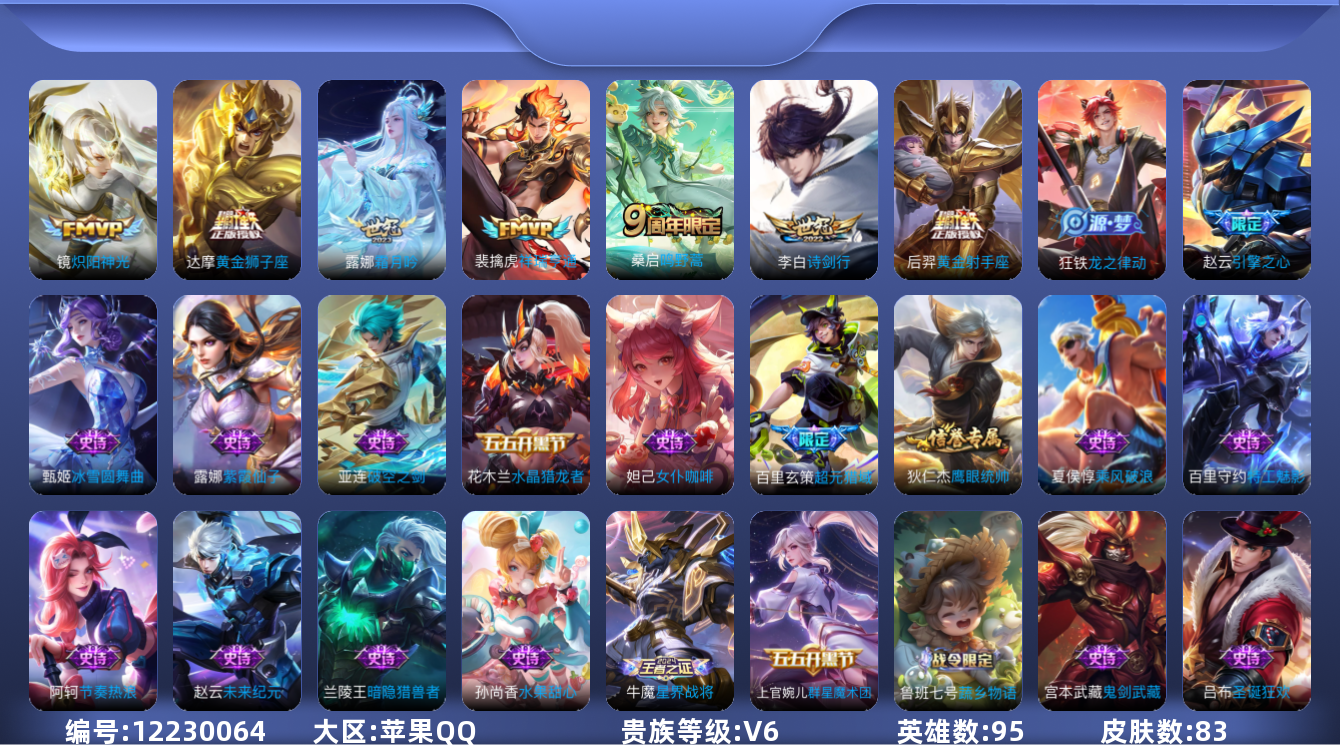 [12230064]V6 7传说 95英雄 83皮肤 可修改实名 连体和平 优质装备:黄金狮子座,黄金射手座,炽阳神光,霜月吟 传说皮:祥瑞亨通 限定皮:鸣野蒿,诗剑行,引擎之心 史诗皮:星界战将,龙之律动,茶境仙,破空之剑,上官婉儿群星魔术团,蔬乡物语(鲁班七号),超元猎域,紫霞仙子,特工魅影,节奏热浪,女仆咖啡,水果甜心,暗隐猎兽者,鬼剑武藏,乘风破浪,水晶猎龙者,圣诞狂欢,鹰眼统帅,未来纪元-赵云