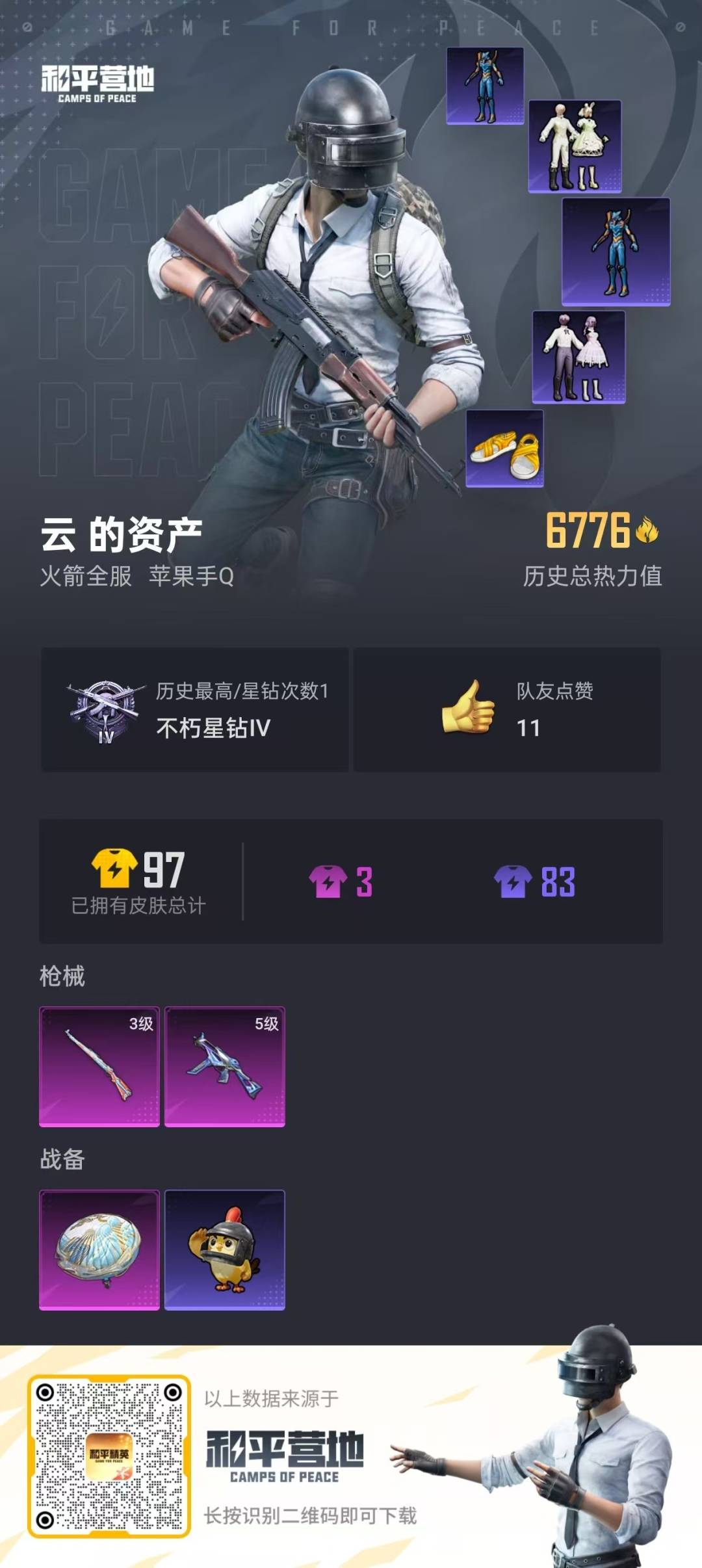 - PX_2089188- 可二次 安卓手Q-6王牌印记-6粉装-4特效枪-1载具-60147热力值-144套装-190枪皮-0卓越印记-0传奇印记 【6粉装】,梦幻火箭,暗夜玫瑰,赤焰黑爵,暗夜鎏金,星夜魔法师,葫芦兄弟 【4特效枪】,M762-冷魅冰骑-7级 Kar98K-创世·救赎-4级 Vector-环太平洋-7级 SPAS-12-音爆索尼克-3级 【5稀有紫装】,暗影哥特,雪山精英,胖达圆