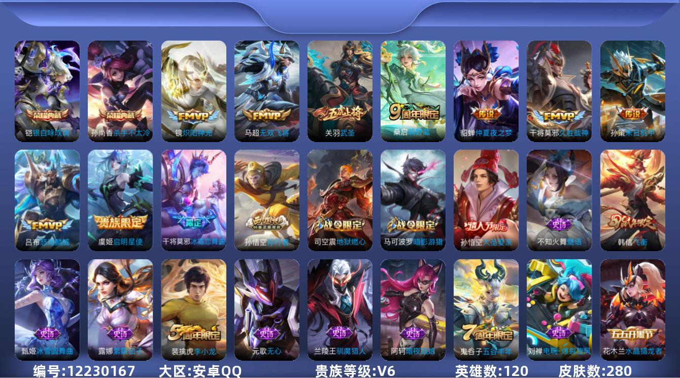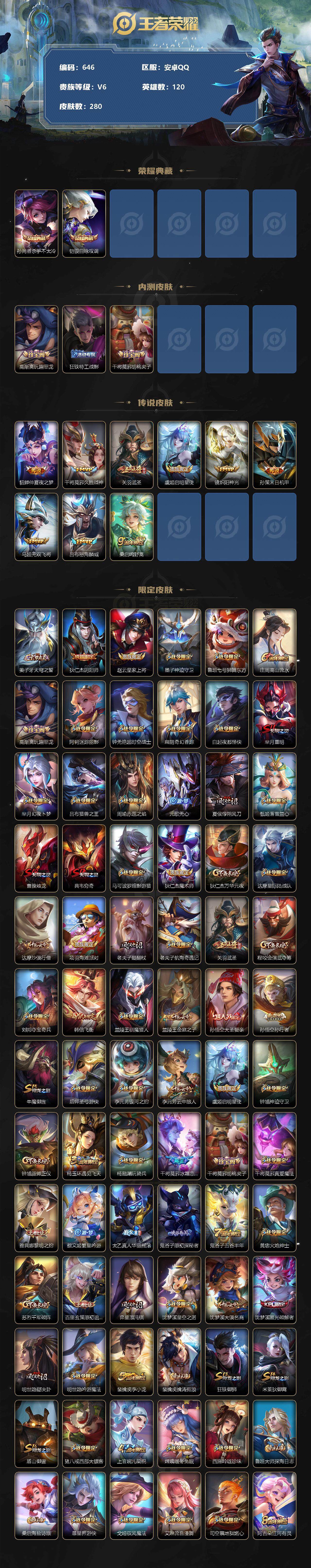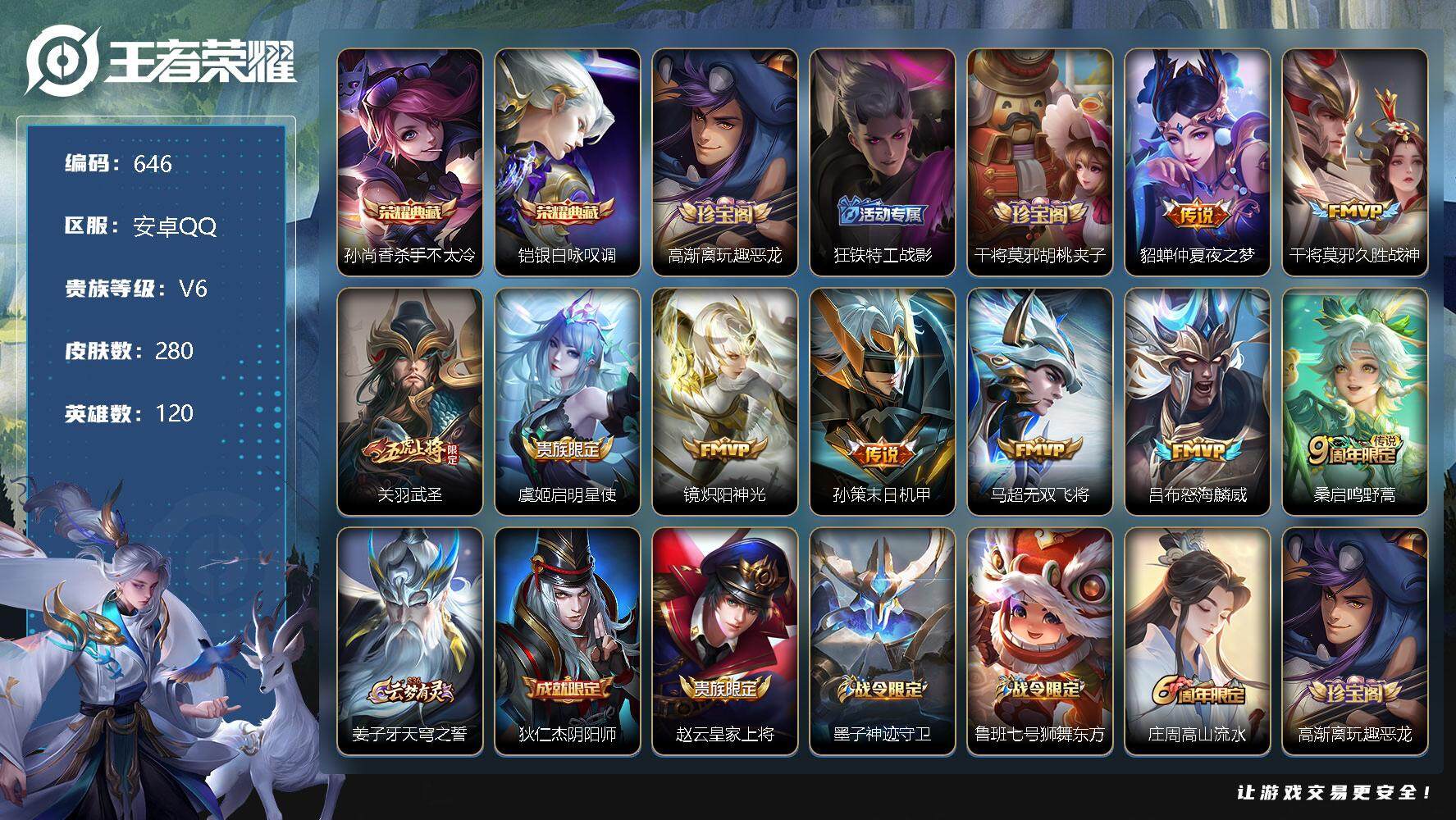 [12230167]【商品标题】:安卓Q-V6-永恒钻石V段位-120英雄-280皮肤-2典藏-0珍品无双-0无双-0珍品传说-9传说-72史诗