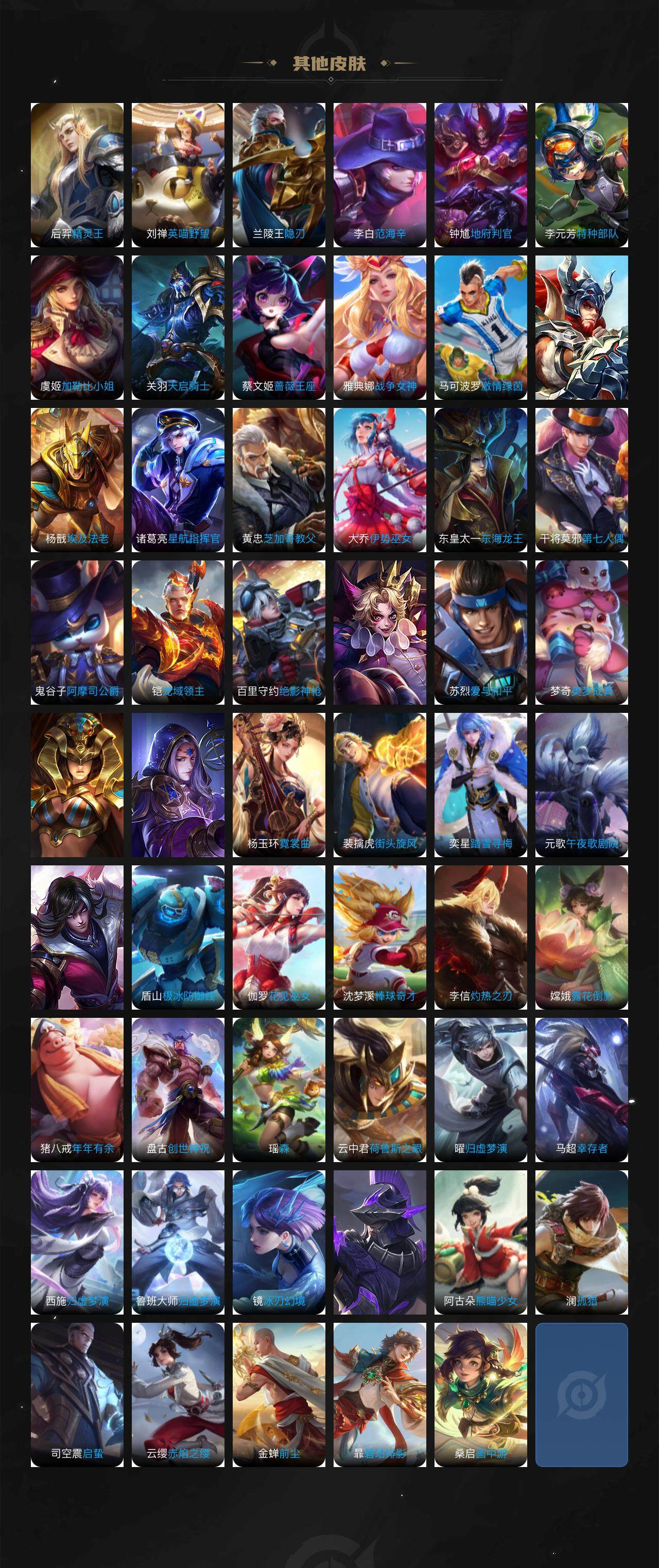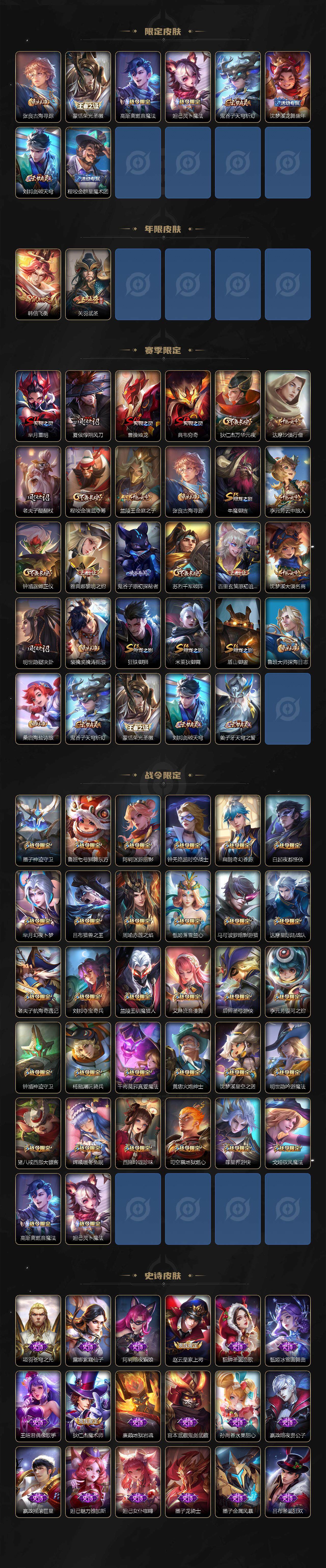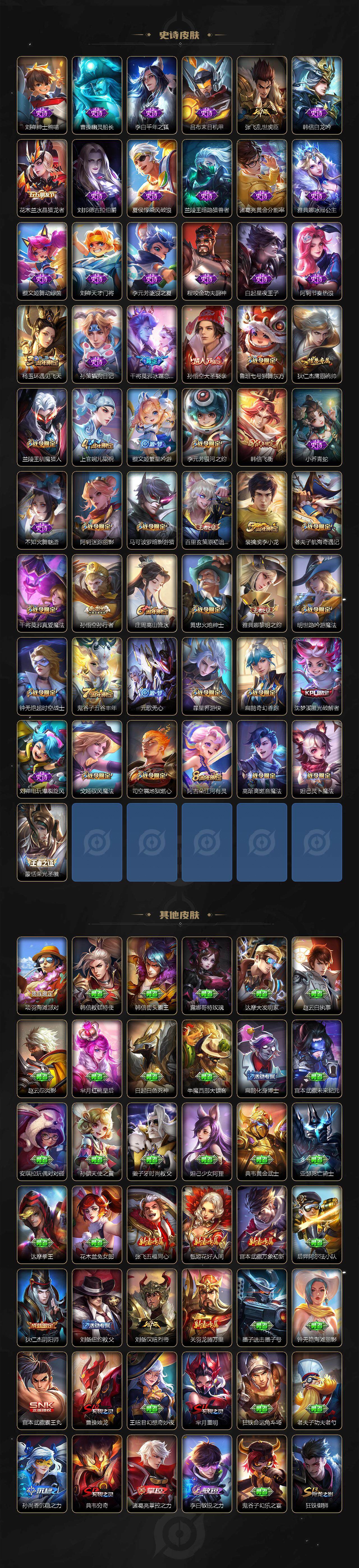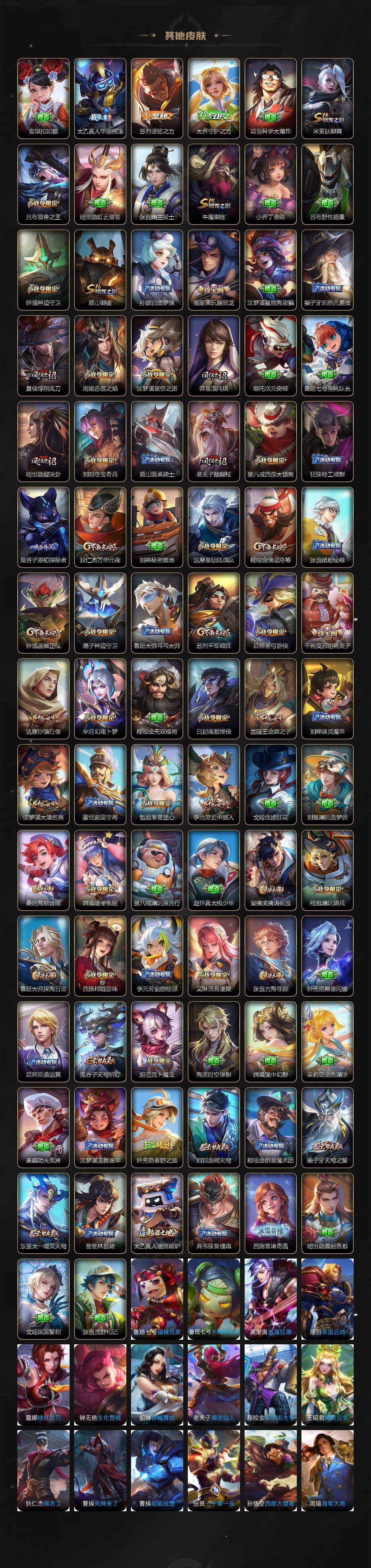 【限定皮肤】:姜子牙天穹之誓,狄仁杰阴阳师,赵云皇家上将,墨子神迹守卫,鲁班七号狮舞东方,庄周高山流水,高渐离玩趣恶龙,阿轲迷踪丽影,钟无艳超时空战士,扁鹊奇幻香踪,白起夜都怪侠,芈月重明,芈月幻夜卜梦,吕布猎兽之王,周瑜赤莲之焰,元歌无心,夏侯惇朔风刀,甄姬落雪兰心,曹操烛龙,典韦穷奇,马可波罗暗影游猎,狄仁杰魔术师,狄仁杰万华元夜,达摩星际陆战队,达摩沙漠行僧,项羽海滩派对,老夫子醍醐杖,老夫子航海奇遇记,关羽武圣,程咬金演武夺筹,刘邦夺宝奇兵,韩信飞衡,兰陵王驯魔猎人,兰陵王金庭之子,孙悟空大圣娶亲,孙悟空孙行者,牛魔御旌,后羿圣弓游侠,李元芳银河之约,李元芳云中旅人,虞姬启明星使,钟馗神迹守卫,钟馗驱傩正仪,杨玉环遇见飞天,杨戬潮玩骑兵,干将莫邪冰霜恋舞曲,干将莫邪胡桃夹子,干将莫邪真爱魔法,雅典娜黎明之约,蔡文姬繁星吟游,太乙真人华丽摇滚,鬼谷子原初探秘者,鬼谷子五谷丰年,黄忠火炮绅士,苏烈千军破阵,百里玄策原初追逐者,弈星混沌棋,沈梦溪星空之诺,沈梦溪大漠名商,沈梦溪匿光破解者,明世隐疑决卦,明世隐吟游魔法,裴擒虎李小龙,裴擒虎擒涛扼浪,狂铁御狮,米莱狄御霄,盾山御銮,猪八戒西部大镖客,上官婉儿梁祝,嫦娥暖冬兔眠,西施玲珑珍味,鲁班大师探海日志,桑启海盐诗旅,暃星界游侠,戈娅驭风魔法,艾琳流音漫舞,司空震地狱燃心,阿古朵江河有灵,张良古海寻踪,蒙恬荣光圣徽,高渐离燃音魔法,妲己灵卜魔法,鬼谷子天穹祈灯,沈梦溪龙舞盛年,刘邦剑破天穹,程咬金群星魔术团