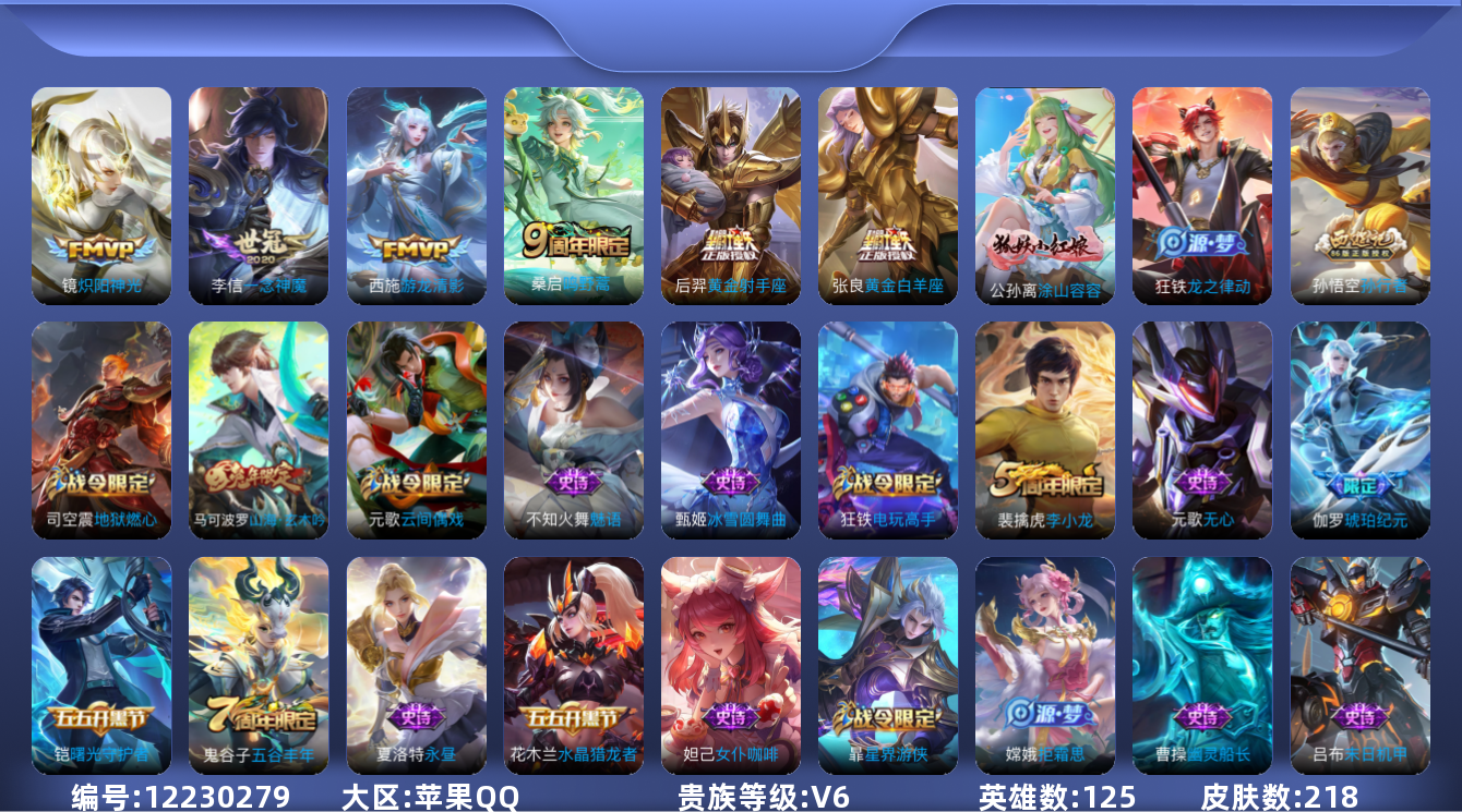 [12230279]V6 6传说 125英雄 218皮肤 可修改实名 优质装备:黄金射手座,黄金白羊座,炽阳神光,一念神魔,游龙清影(小青龙),涂山容容 珍宝阁皮:胡桃夹子,女武神 限定皮:鸣野蒿,高山流水,五谷丰年,梁祝,李小龙,孙行者,山海·玄木吟(马可年限) 史诗皮:星界战将,龙之律动,琥珀纪元伽罗,黄金分割率,特工魅影,永昼,江河有灵,魅语,百解令(蒙犽),高渐离燃音魔法,蒙恬荣光圣徽,冰冠公主,偶像歌手,末日机甲-吕布,乱世虎臣,节奏热浪,女仆咖啡,摇滚巨星,水果甜心,绅士熊喵,天才门将,星夜王子,功夫厨神,德古拉伯爵,暗隐猎兽者,幽灵船长,鬼剑武藏,地狱岩魂,纤云弄巧,拒霜思,缤纷独角兽,乘风破浪,逐浪之夏,月团寄思,水晶猎龙者,曙光守护者,金属风暴,原初追逐者,圣诞恋歌,鹰眼统帅,魅力维加斯,黎明之约,无心