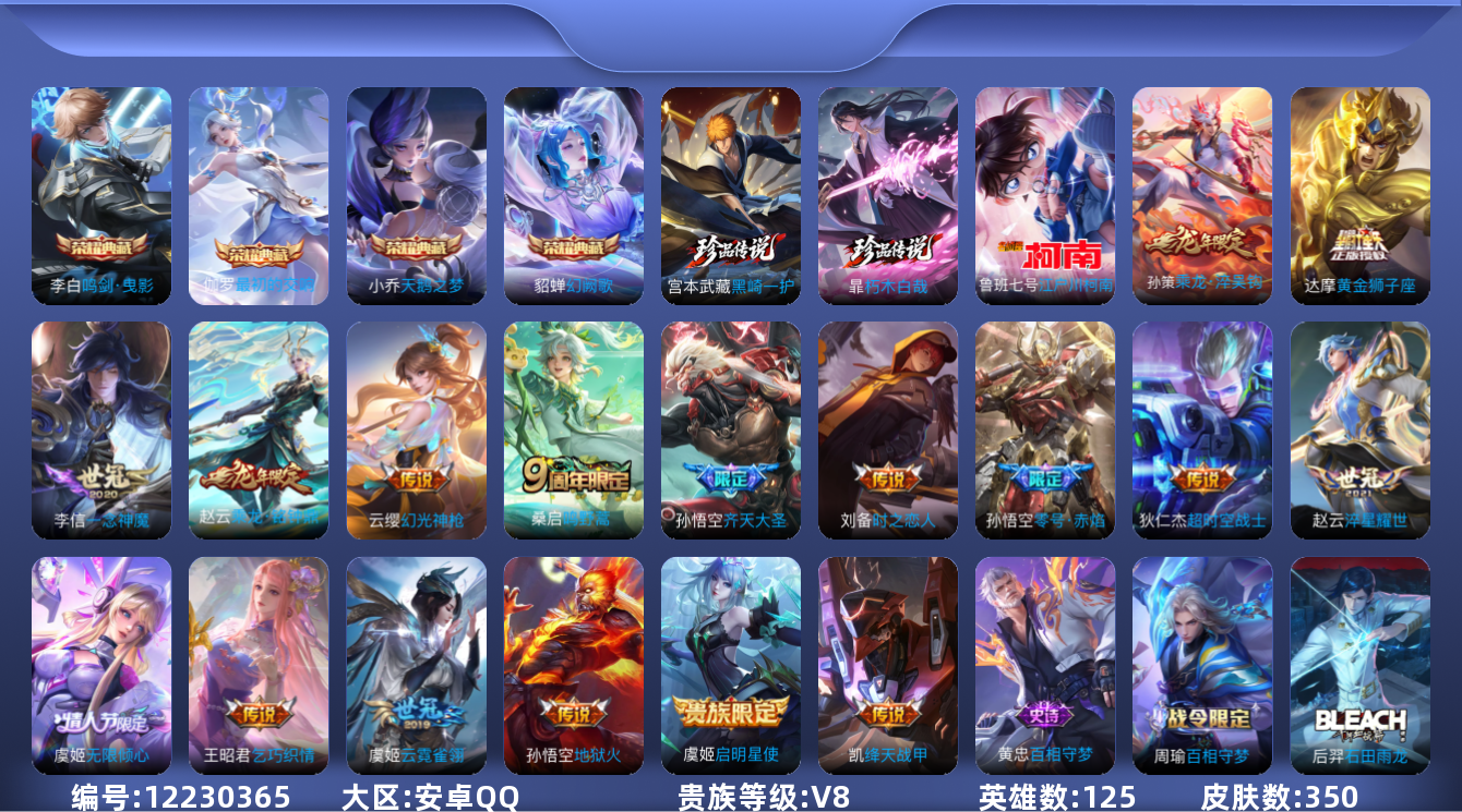 [12230365]V8 4典藏 3珍品传说 17传说 125英雄 350皮肤 可修改实名 连体和平优质装备:天鹅之梦(小乔典藏),鸣剑·曳影,幻阙歌(貂蝉典藏),最初的交响(伽罗典藏),江户川柯南,朽木白哉,黑崎一护,黄金狮子座,绛天战甲(鸡嘴战神),一念神魔,云霓雀翎,地狱火,零号·赤焰,乞巧织情,时之恋人-刘备(电焊工),淬星耀世,超时空战士-狄仁杰 传说皮:乘龙·铭钟鼎(赵云年限),乘龙·淬吴钩(孙策年限),幻光神枪 珍宝阁皮:妄想食味,胡桃夹子 限定皮:逐霄战戟,陌上桑,鸣野蒿,至尊宝,傲雪梅枪,无限倾心-虞姬,齐天大圣,五谷丰年,游园惊梦,孙行者,大圣娶亲,美猴王,山海·玄木吟(马可年限) 史诗皮:鸭鸭历险记-刘禅,器灵·浮梦炉,化蝶舞,星界战将,龙之律动,雪豹·霜爪,石田雨龙,百相守梦-周瑜,茶境仙,怒海争锋,破空之剑,东方月初,海诺心动手记,蔬乡物语(鲁班七号),百相守梦-百里守约,百相守梦-黄忠,紫霞仙子,苍穹之光,电玩小子(小书包),黄金分割率,特工魅影,千年之狐,江河有灵,百解令(蒙犽),高渐离燃音魔法,蒙恬荣光圣徽,无限星赏官,偶像歌手,电玩·爆裂旋风,暗夜猫娘,龙骑士(小龙虾),末日机甲-吕布,猫狗日记-孙策,时之恋人-孙尚香,乱世虎臣,节奏热浪,女仆咖啡,摇滚巨星,水果甜心,绅士熊喵,天才门将,星夜王子,心灵骇客,功夫厨神,德古拉伯爵,暗隐猎兽者,幽灵船长,鬼剑武藏,心灵战警,乐园奇幻夜,舞动绿茵,地狱岩魂,纤云弄巧,拒霜思,缤纷独角兽,乘风破浪,逐浪之夏,月团寄思,水晶猎龙者,曙光守护者,箭羽风息,金属风暴,原初追逐者,圣诞狂欢,圣诞恋歌,鹰眼统帅,暗夜贵公子,魅力维加斯,黎明之约,赏金猎手,无心,未来纪元-赵云