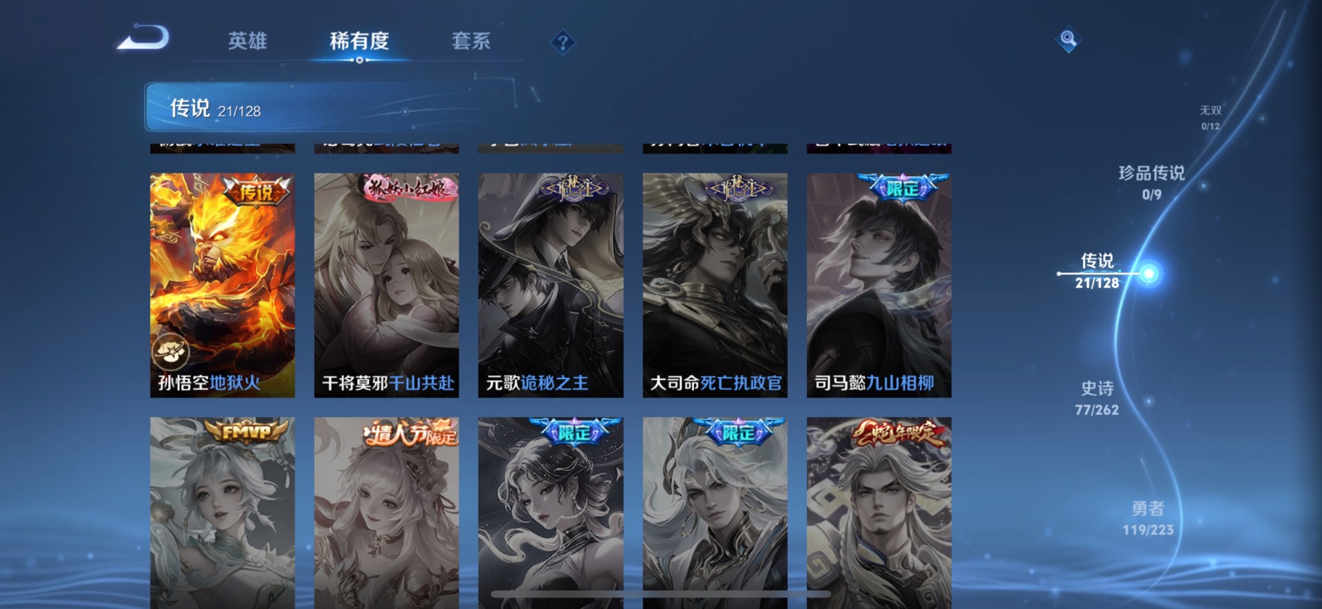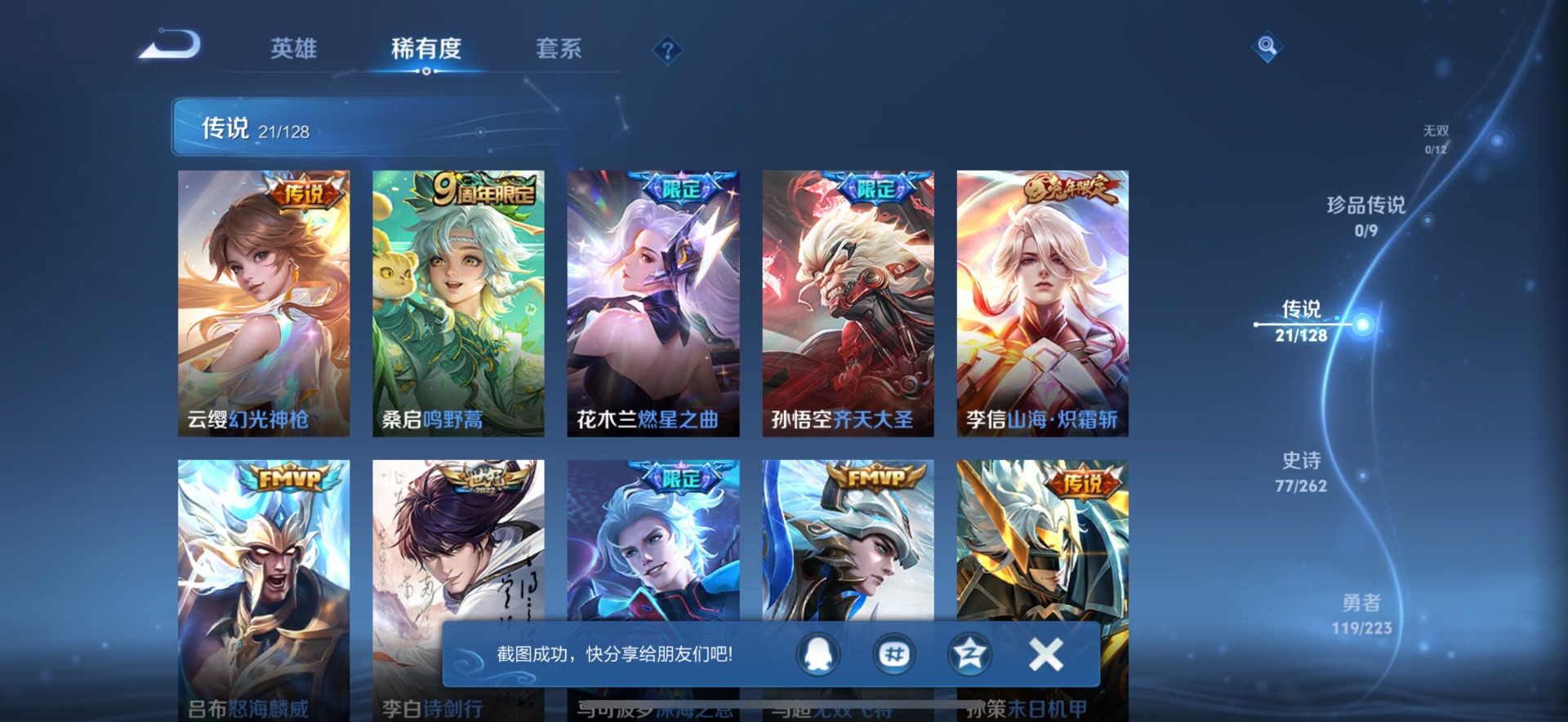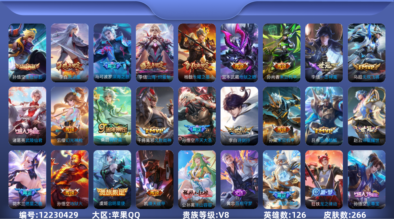 [12230429]V8 1典藏 21传说 126英雄 266皮肤 可修改实名 优质装备:全息碎影(猴子典藏),绛天战甲(鸡嘴战神),久胜战神,一念神魔,末日机甲-孙尚香(绿蚂蚱),地狱火,地狱之眼,淬星耀世,末日机甲-孙策,无双飞将,山海·炽霜斩(李信年限),燃星之曲,涂山容容 传说皮:幻光神枪 珍宝阁皮:蔷薇恋人,女武神 限定皮:逐霄战戟,鸣野蒿,至尊宝,凤求凰(白切鸡),武陵仙君(小桃花),傲雪梅枪,魔法小厨娘,神威(电光马子),飞衡(韩信年限),高山流水,诗剑行,齐天大圣,怒海麟威,五谷丰年,青龙志(铠年限),冰锋战神,龙胆,李小龙,永曜之星,孙行者,猪悟能,大圣娶亲,深海之息(深海大菠萝),山海·玄木吟(马可年限) 史诗皮:化蝶舞,龙之律动,星界战将,藏狐·褐绒,百相守梦-黄忠,星界特工,破空之剑,东方月初,怒海争锋,紫霞仙子,苍穹之光,电玩小子(小书包),白龙吟,黄金分割率,特工魅影,千年之狐,无限星赏官,偶像歌手,末日机甲-吕布,猫狗日记-孙策,节奏热浪,修罗,女仆咖啡,摇滚巨星,水果甜心,天才门将,星夜王子,功夫厨神,德古拉伯爵,暗隐猎兽者,幽灵船长,鬼剑武藏,心灵战警,纤云弄巧,繁星吟游(呼啦呼啦),乘风破浪,逐浪之夏,水晶猎龙者,曙光守护者,金属风暴,原初追逐者,圣诞狂欢,圣诞恋歌,鹰眼统帅,暗夜贵公子,魅力维加斯,赏金猎手,无心,未来纪元-赵云