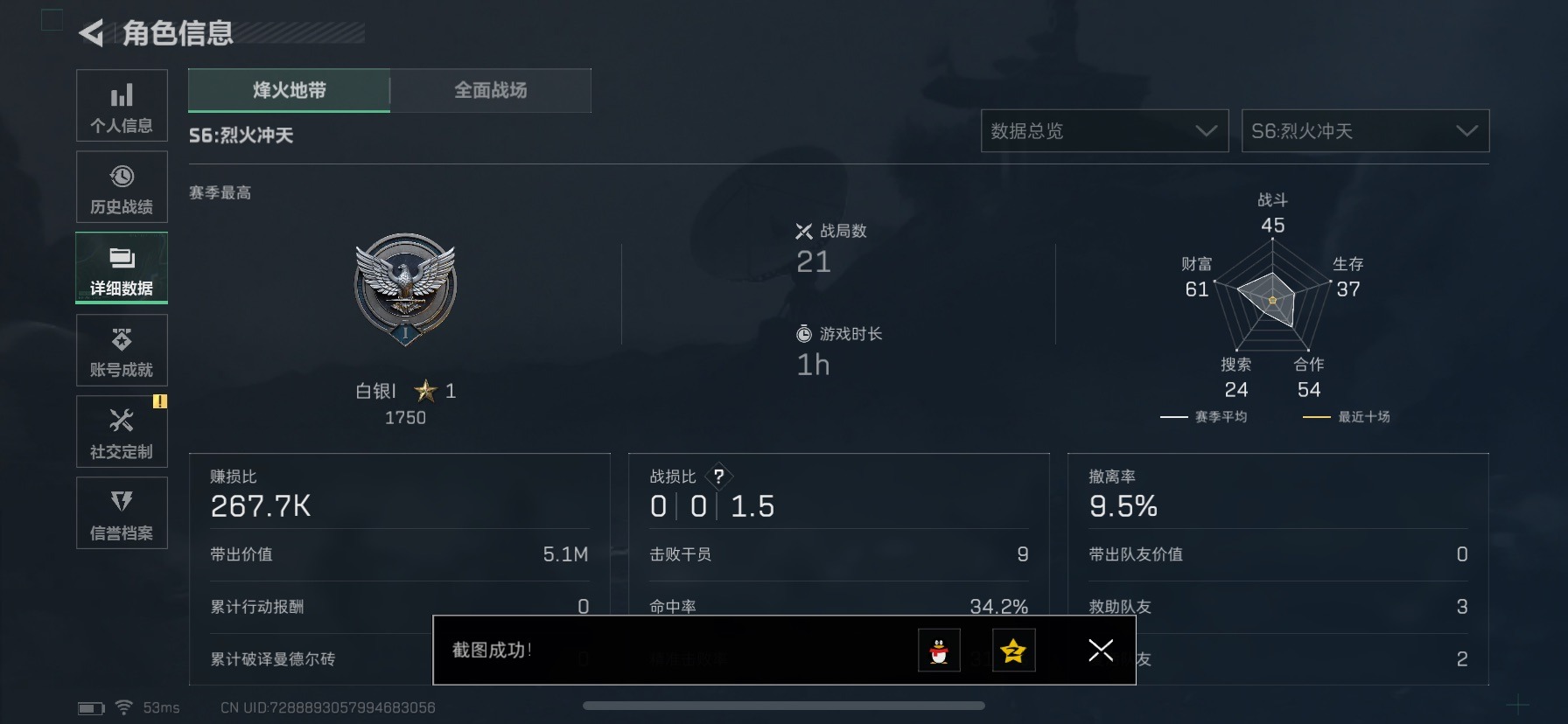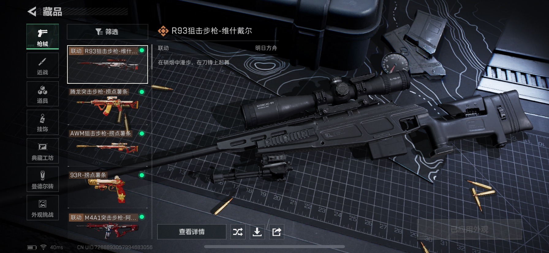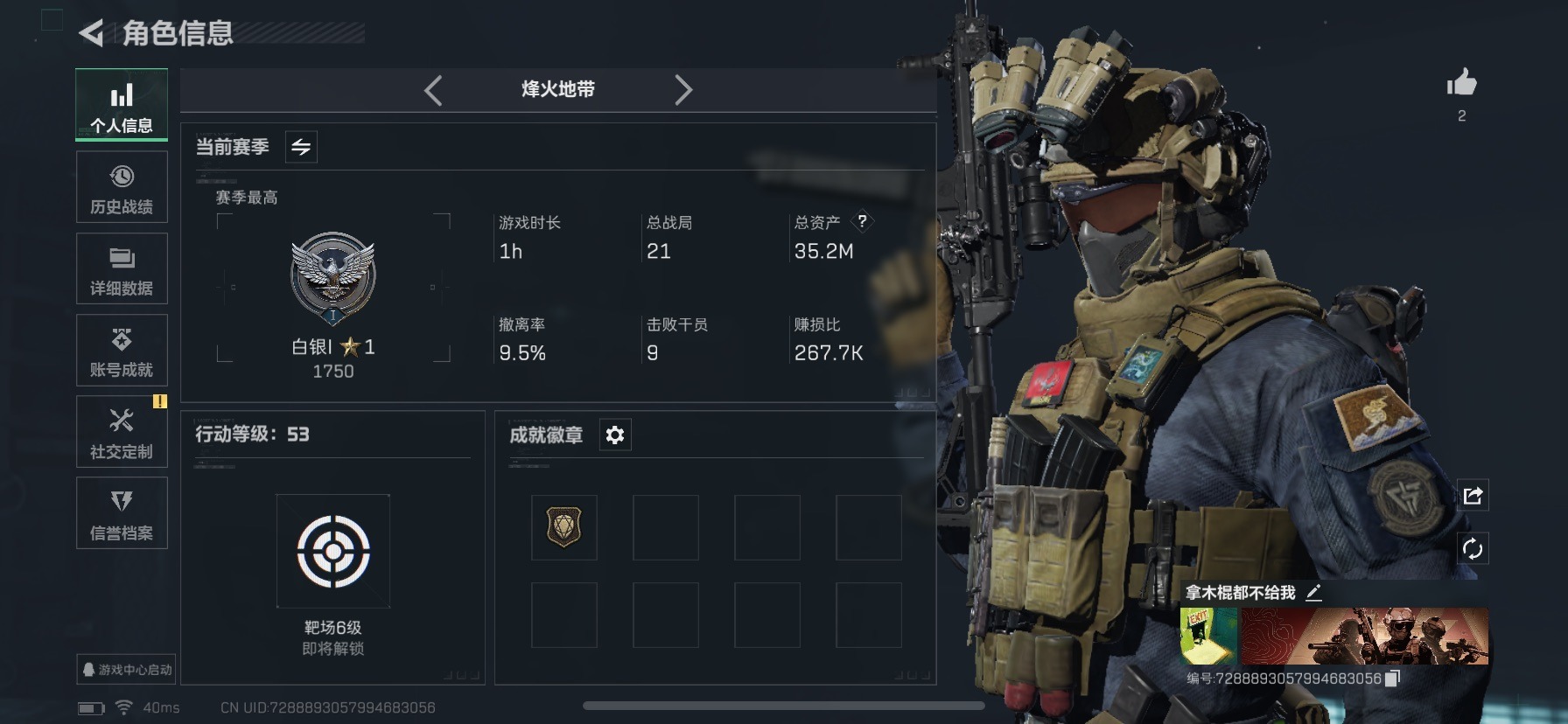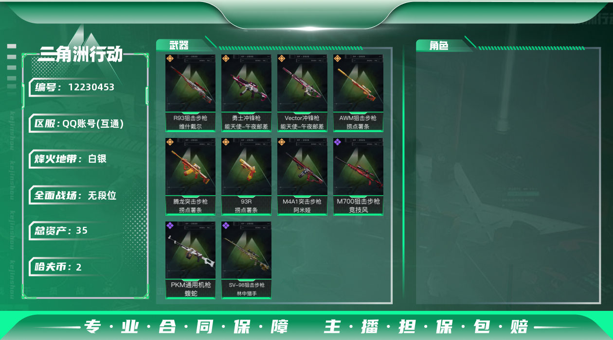 [12230453]总资产:35.2M 7传说枪械 哈夫币:2.787K 可二次 可修改实名 烽火地带段位:白银 全面战场段位:无段位 传说武器皮肤:Vector冲锋枪-能天使-午夜邮差,R93狙击步枪-维什戴尔,勇士冲锋枪-能天使-午夜邮差,M4A1突击步枪-阿米娅,AWM狙击步枪-捞点薯条,腾龙突击步枪-捞点薯条,93R-捞点薯条 史诗武器皮肤:PKM通用机枪-蝮蛇,SV-98狙击步枪-林中猎手,M700狙击步枪-竞技风
