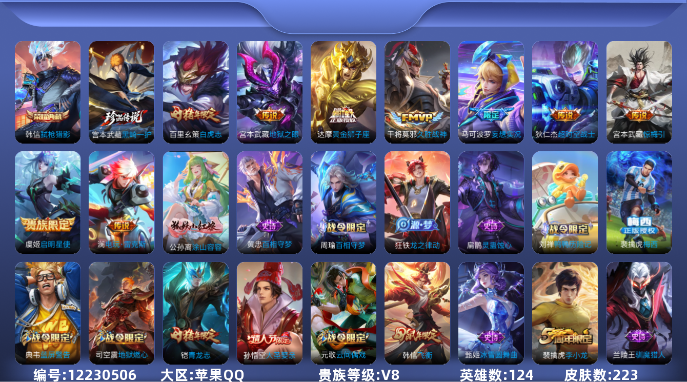 [12230506]V8 1典藏 1珍品传说 9传说 124英雄 223皮肤 可修改实名 优质装备:弑枪猎影(韩信典藏),黑崎一护,黄金狮子座,久胜战神,地狱之眼,超时空战士-狄仁杰,电玩·雷克斯,妄想实况,惊梅引,涂山容容 珍宝阁皮:蔷薇恋人 限定皮:白虎志(电光耗子),梅西,飞衡(韩信年限),青龙志(铠年限),梁祝,李小龙,逐梦之影,大圣娶亲 史诗皮:鸭鸭历险记-刘禅,灵蛊蚀心,龙之律动,百相守梦-周瑜,百相守梦-黄忠,千年之狐,江河有灵,蒙恬荣光圣徽,冰冠公主,龙骑士(小龙虾),乱世虎臣,节奏热浪,水果甜心,绅士熊喵,星夜王子,德古拉伯爵,幽灵船长,鬼剑武藏,舞动绿茵,繁星吟游(呼啦呼啦),缤纷独角兽,乘风破浪,水晶猎龙者,曙光守护者,箭羽风息,圣诞狂欢,鹰眼统帅,天秀·音浪,未来纪元-赵云