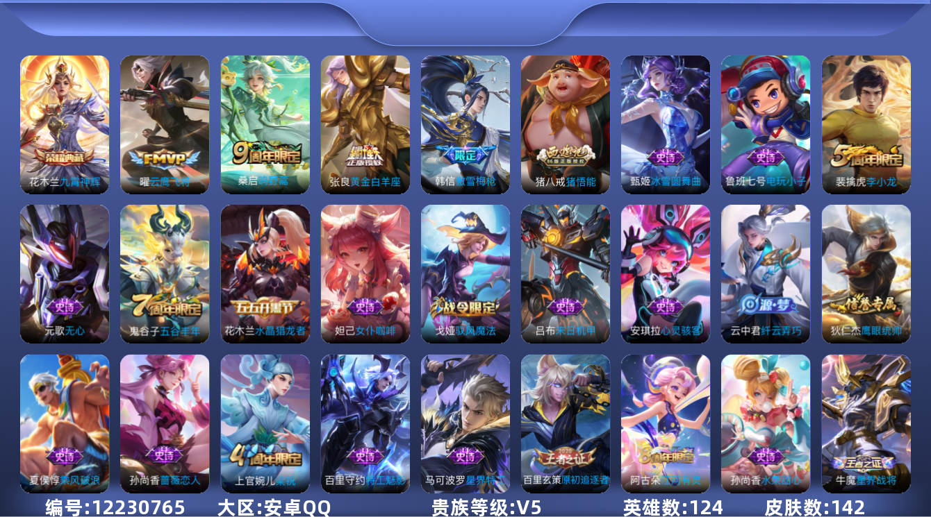 [12230765]V5 1典藏 3传说 124英雄 142皮肤 可修改实名 优质装备:九霄神辉(木兰典藏),云鹰飞将(小将军),黄金白羊座 珍宝阁皮:蔷薇恋人,女武神 限定皮:逐霄战戟,鸣野蒿,傲雪梅枪,高山流水,五谷丰年,梁祝,李小龙,猪悟能 史诗皮:星界战将,蒙犽顽岩魄,星界特工,电玩小子(小书包),特工魅影,江河有灵,末日机甲-吕布,女仆咖啡,摇滚巨星,水果甜心,绅士熊喵,心灵骇客,鬼剑武藏,地狱岩魂,纤云弄巧,缤纷独角兽,乘风破浪,逐浪之夏,水晶猎龙者,金属风暴,原初追逐者,圣诞恋歌,鹰眼统帅,魅力维加斯,无心