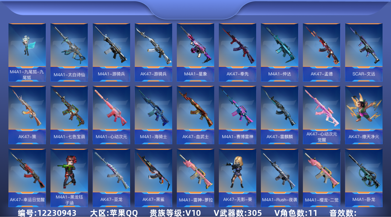 [12230943]V10 8王者武器 305英雄武器 11英雄角色 可二次 可修改实名 优质装备:M4A1-星象,M4A1-雷霆王者,AK47-奉先,王者之竞,王者之城,M4A1-七色宝葫,M4A1-仲达,M4A1-游骑兵,王者之戮,王者之势 v武器:M4A1-太白诗仙,M4A1-九尾狐-九尾狐,SCAR-幽暗骑士,M4A1-玫瑰精灵,AK47-火麒麟,AK47-无影,AK47-麒麟,M4A1-死神,AK47-黑武士觉醒,AK47-沙漠领主,QBZ95-天使,AK47-游骑兵,M4A1-君威GS,AK47-策,AK47-幸运日觉醒,AK47-燎天净火,AK47-心动次元觉醒,AK47-雷麒麟,M4A1-赛博雷神,AK47-血武士,M4A1-海骑士,M4A1-黑龙钰-子涵,M4A1-武圣,AK47-冰魂觉醒,M4A1-Rush-夜袭,AK47-无影-葵,M4A1-雷神-萝拉,SCAR-文远,AK47-亚龙,AK47-孟德,M4A1-卧龙,M4A1-心动次元,M4A1-樱龙·二觉,AK47-黑鲨 王者武器:王者之圣,王者之魄-冠军珍藏,王者之心
