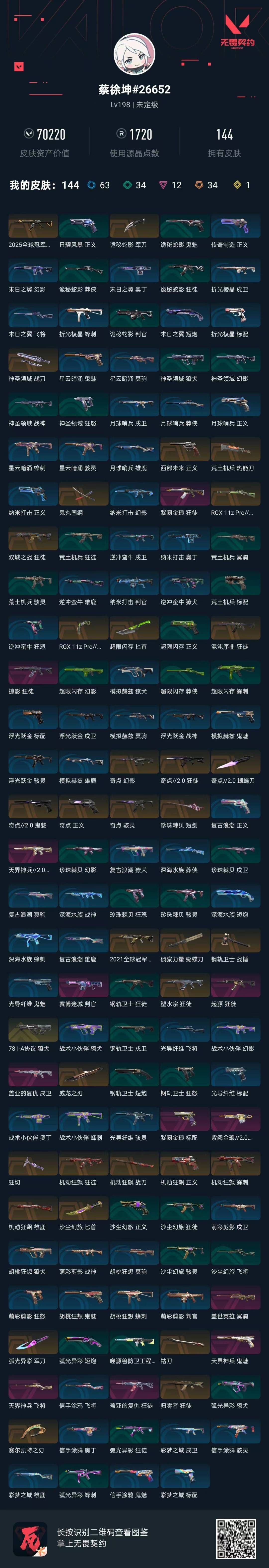 [12231034]34橙皮 1金皮 12紫皮 144皮肤 27英雄 171卡面 1720已用源晶 未定级 优质装备:机动狂飙套装,奇点//2.0套装,正义-奇点,狂徒-归零者,狂徒-塑水宗,狂徒-2021全球冠军赛,狂徒-混沌序曲,狂徒-掠影,幻影-奇点,狂徒-紫阙金琅,狂徒-盖亚的复仇,狂徒-机动狂飙,正义-机动狂飙,獠犬-781-A协议,幻影-天界神兵2.0,狂徒-奇点//2.0,标配-紫阙金琅,骇灵-奇点,赛尔凯特之刃,狂切,戍卫-盖亚的复仇,祜刀,蝴蝶刀-侦察力量,狂徒-起源,鬼魅-天界神兵,飞将-天界神兵,雄鹿-机动狂飙,机动狂飙战刀,奥丁-紫阙金琅2.0,威龙之刃,爪刀-RGX 11z Pro 3.0,匕首-超限闪存,鬼魅-奇点//2.0,蝴蝶刀-奇点//2.0,荒土机兵热能刀,鬼丸国纲,神圣领域 战刀,诡秘蛇影,2025全球冠军赛 狂徒 佩枪皮肤:正义-西部未来 冲锋枪皮肤:蜂刺-机动狂飙 霰弹枪皮肤:判官-赛博迷城 步枪皮肤:狂徒-双城之战 狙击枪皮肤:冥驹-盖世英雄,莽侠-RGX 11z Pro 3.0 近战武器皮肤:战锤-钢轨卫士,短剑-珍珠棘贝,匕首-沙尘幻旅,军刀-弧光异彩