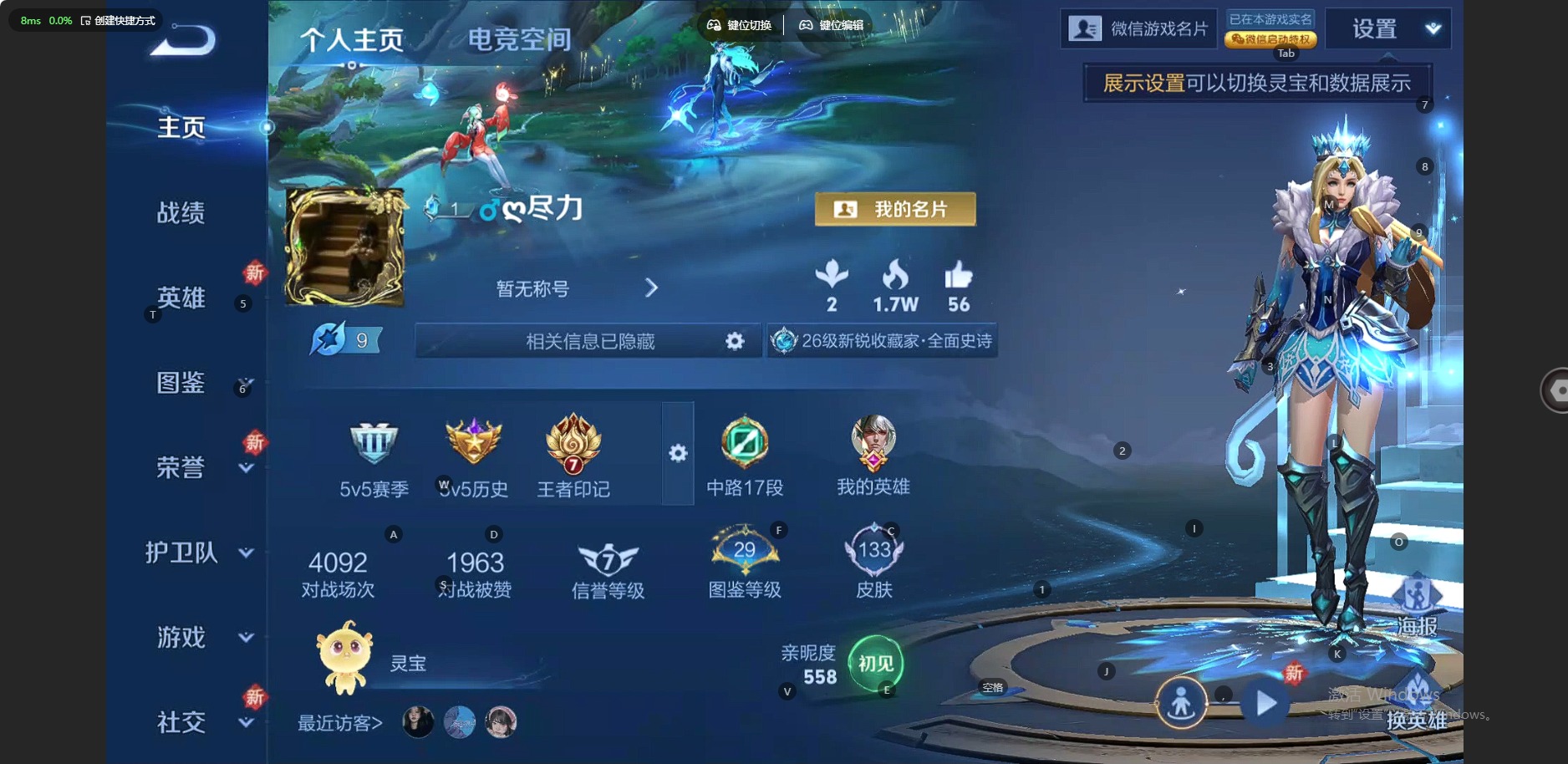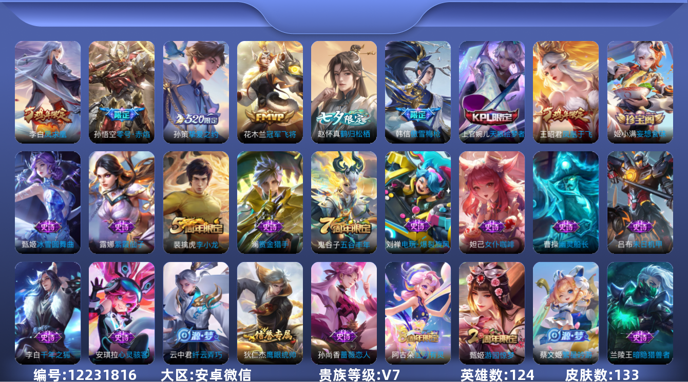 - [11528155]V7 7传说 123英雄 210皮肤 可修改实名 女号 优质装备:末日机甲-孙尚香(绿蚂蚱),李逍遥 传说皮:幻光神枪 珍宝阁皮:蔷薇恋人,玩趣恶龙 限定皮:白虎志(电光耗子),武陵仙君(小桃花),傲雪梅枪,时雨天司(水龙头),神威(电光马子),高山流水,齐天大圣,匿光决锋者,五谷丰年,青龙志(铠年限),游园惊梦,梁祝,李小龙,朱雀志(守约年限),时之祈愿-云中君,百木心枪,玉兔公主,山海·玄木吟(马可年限) 史诗皮:化蝶舞,石田雨龙,紫霞仙子,白龙吟,特工魅影,千年之狐,百解令(蒙犽),冰冠公主,偶像歌手,暗夜猫娘,末日机甲-吕布,猫狗日记-孙策,节奏热浪,修罗,女仆咖啡,水果甜心,绅士熊喵,天才门将,星夜王子,心灵骇客,功夫厨神,幽灵船长,鬼剑武藏,纤云弄巧,繁星吟游(呼啦呼啦),拒霜思,缤纷独角兽,水晶猎龙者,金属风暴,原初追逐者,圣诞狂欢,圣诞恋歌,鹰眼统帅,暗夜贵公子,魅力维加斯,赏金猎手,天秀·音浪,无心,未来纪元-赵云