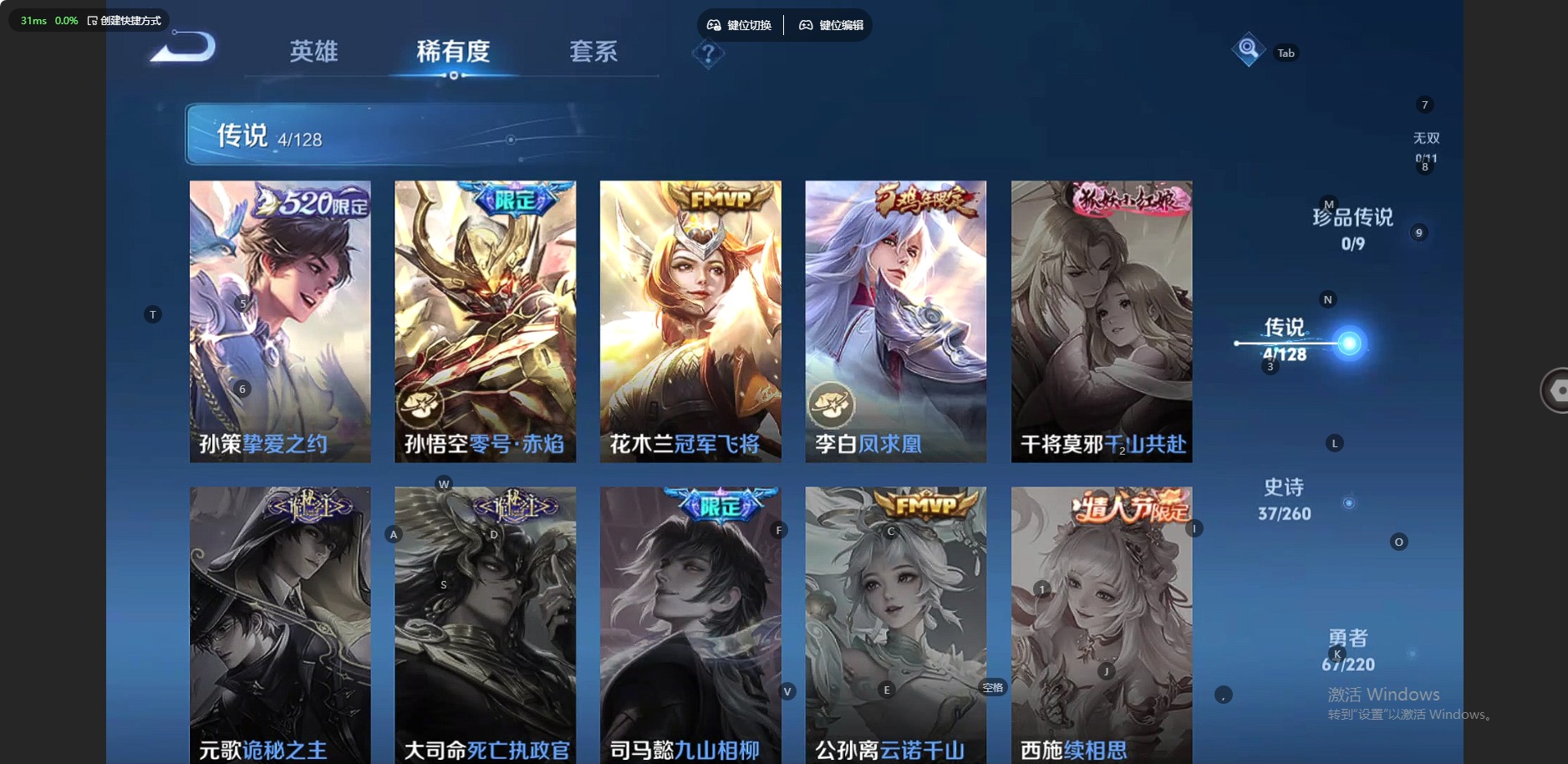 [12231816]V7 4传说 124英雄 133皮肤 可修改实名 安全保护中 优质装备:冠军飞将,零号·赤焰,挚爱之约 珍宝阁皮:妄想食味,蔷薇恋人 限定皮:凤求凰(白切鸡),凤凰于飞,傲雪梅枪,高山流水,降魔,五谷丰年,游园惊梦,天狼绘梦者,李小龙 史诗皮:紫霞仙子,千年之狐,江河有灵,鹤归松栖(赵怀真),蒙恬荣光圣徽,匿光破解者,冰冠公主,偶像歌手,电玩·爆裂旋风,末日机甲-吕布,女仆咖啡,水果甜心,心灵骇客,暗隐猎兽者,幽灵船长,心灵战警,舞动绿茵,纤云弄巧,繁星吟游(呼啦呼啦),缤纷独角兽,金属风暴,鹰眼统帅,暗夜贵公子,赏金猎手