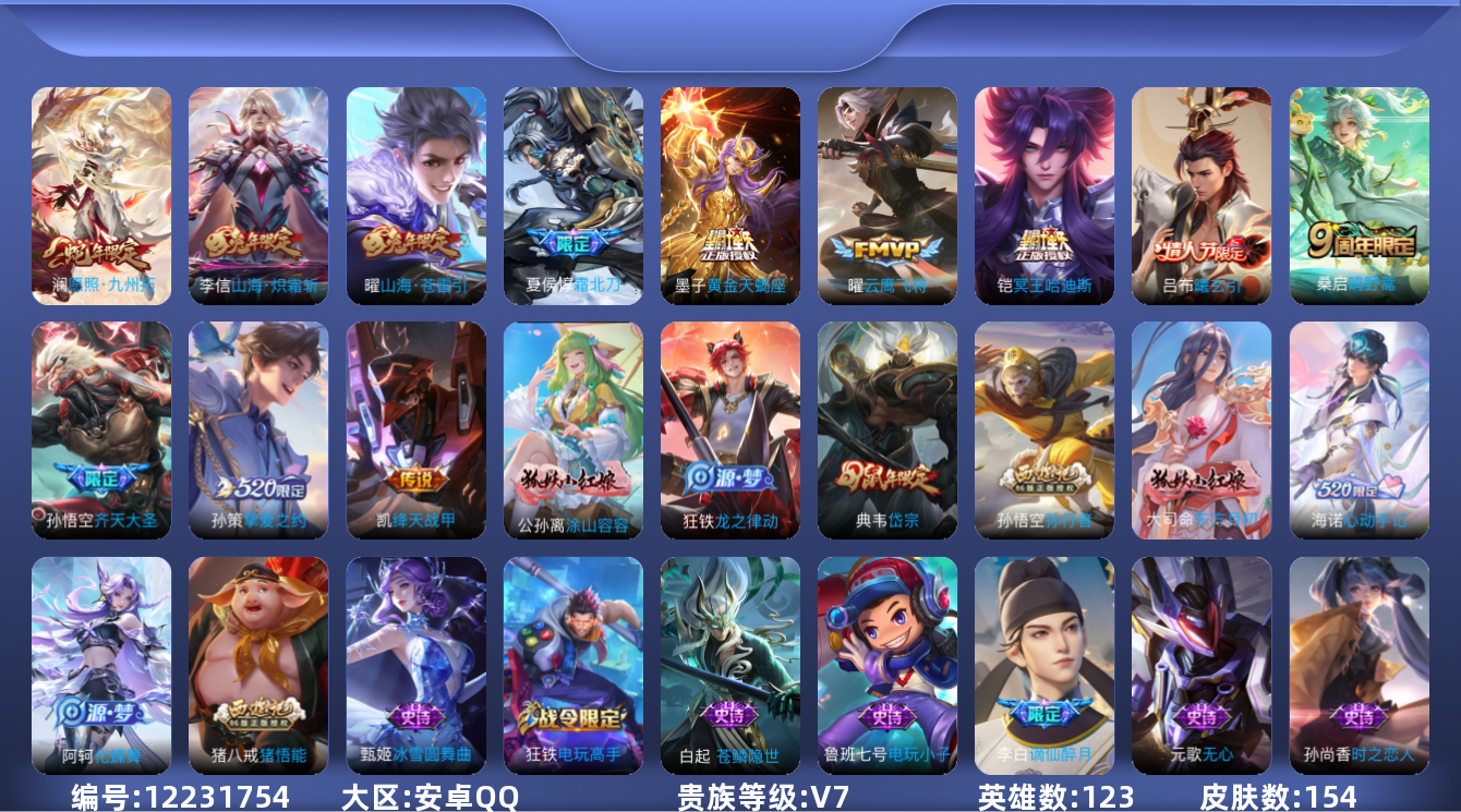 [12231754]V7 12传说 123英雄 154皮肤 可修改实名 优质装备:云鹰飞将(小将军),绛天战甲(鸡嘴战神),挚爱之约,山海·炽霜斩(李信年限),山海·苍雷引(电光曜子),黄金天蝎座,涂山容容 传说皮:吕布曦玄引,铠冥王哈迪斯 珍宝阁皮:万物之道,蔷薇恋人 限定皮:愿照·九州拓(澜年限),逐霄战戟,鸣野蒿,夏侯惇霜北刀,高山流水,齐天大圣,五谷丰年,岱宗(典韦年限),孙行者,猪悟能 史诗皮:苍鳞隐世,绮世丹青,化蝶舞,谪仙醉月,龙之律动,怒海争锋,东方月初,蒙犽顽岩魄,海诺心动手记,蔬乡物语(鲁班七号),苍穹之光,电玩小子(小书包),永昼,冰冠公主,猫狗日记-孙策,时之恋人-孙尚香,乱世虎臣,节奏热浪,水果甜心,心灵骇客,功夫厨神,暗隐猎兽者,鬼剑武藏,心灵战警,地狱岩魂,金属风暴,鹰眼统帅,魅力维加斯,无心,未来纪元-赵云