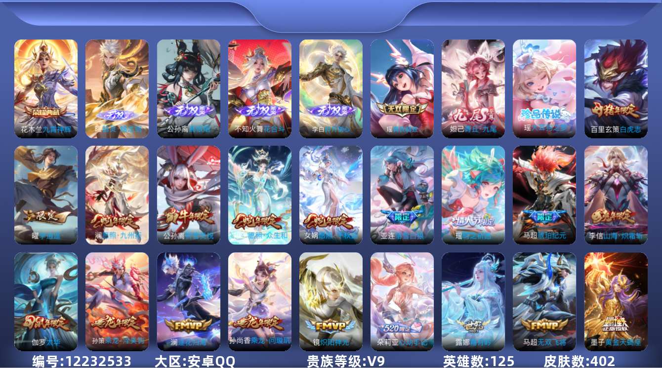 [12232533]V9 1典藏 6无双 1珍品传说 41传说 125英雄 402皮肤 可修改实名 优质装备:九霄神辉(木兰典藏),真我赫兹(瑶)(瑶无双),青丘·九尾(妲己无双),碎月剑心(李白无双),花合斗,离恨烟(公孙离无双),器灵·螭龙剑,大耳狗之梦,黄金射手座,云鹰飞将(小将军),炽阳神光,地狱火,李逍遥,游龙清影(小青龙),无双飞将,碎云,山海·炽霜斩(李信年限),记忆之芯(机甲兔),青丘·九尾,鹤羽星尊,妄想实况,霜月吟,澜逐花归海,琥珀纪元马超,黄金天蝎座,朵莉亚心动手记,玄雷天君 传说皮:乘龙·问璇玑(孙尚香年限),乘龙·铭钟鼎(赵云年限),乘龙·淬吴钩(孙策年限),貂蝉曦玄引,落雪白狼,铠冥王哈迪斯,星之鸣奏,祥瑞亨通,幻光神枪 珍宝阁皮:妄想食味,玩趣恶龙 限定皮:愿照·九州拓(澜年限),愿照·众生和(妲己年限),愿照·千秋盛(女娲年限),逐霄战戟,鸣野蒿,白虎志(电光耗子),太华(伽罗年限),武陵仙君(小桃花),傲雪梅枪,时之彼端,魔法小厨娘,时雨天司(水龙头),神威(电光马子),山海·碧波行(瑶年限),瑞麟志(木兰年限),至美·乘鲤谣,高山流水,齐天大圣,五谷丰年,青龙志(铠年限),武圣,天狼运算者,梁祝,天狼狩猎者,逐梦之翼,岱宗(典韦年限),逐梦之音,祈雪灵祝(雪兔子),天狼绘梦者,逐梦之影,辉光之辰,默契交锋-兰陵王,默契交锋-花木兰,孙行者,猪悟能,一生所爱,引擎之心,青春决赛季,冰霜恋舞曲,云端筑梦师,乒乒小将,蜜橘之夏,美猴王,时之祈愿-瑶(瑶传限),玉兔公主,神器·万象笔,山海·玄木吟(马可年限) 史诗皮:鸭鸭历险记-刘禅,飞车小橘子,器灵·浮梦炉,化蝶舞,龙之律动,石田雨龙,茶境仙,乘龙·忆丹青(大乔年限),炽弈燎原,破空之剑,战舞者,涂山红红,东方月初,乘龙·聚宝船(安琪拉年限),海诺心动手记,决胜骁骑,上官婉儿群星魔术团,蔬乡物语(鲁班七号),超元猎域,百相守梦-百里守约,织梦人,紫霞仙子,特工魅影,千年之狐,冰冠公主,白蛇,真我赫兹(百里守约),匿光侦查者,江河有灵,青蛇,百解令(蒙犽),高渐离燃音魔法,蒙恬荣光圣徽,无限星赏官,晚萤,偶像歌手,匿光破解者,百相守梦(关羽),末日机甲-吕布,猫狗日记-孙策,猫狗日记-大乔,时之恋人-孙尚香,乱世虎臣,节奏热浪,女仆咖啡,摇滚巨星,水果甜心,绅士熊喵,天才门将,心灵骇客,功夫厨神,德古