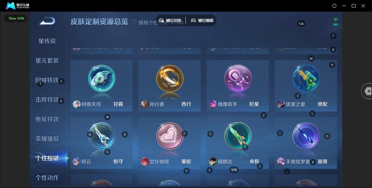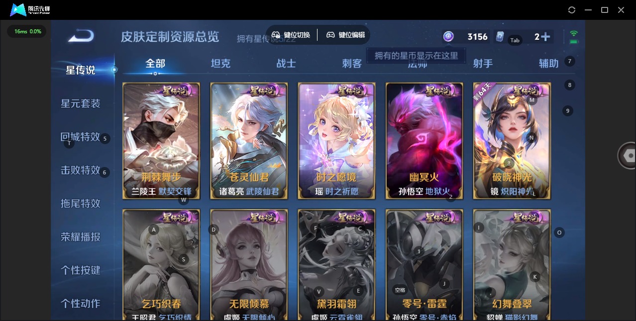 哪吒逐梦之翼,铠青龙志,伽罗太华,孙膑天狼运算者,干将莫邪冰霜恋舞曲,典韦岱宗,鲁班七号乒乒小将,后羿辉光之辰,露娜一生所爱,庄周云端筑梦师,诸葛亮时雨天司,公孙离祈雪灵祝,兰陵王默契交锋,公孙离玉兔公主,公孙离蜜橘之夏,貂蝉逐梦之音,裴擒虎天狼狩猎者,上官婉儿梁祝,上官婉儿神器·万象笔,上官婉儿天狼绘梦者,花木兰默契交锋,花木兰瑞麟志,花木兰青春决赛季,安琪拉魔法小厨娘,马可波罗山海·玄木吟,西施至美·乘鲤谣,桑启鸣野蒿,猪八戒猪悟能,女娲愿照·千秋盛,孙悟空孙行者,孙悟空美猴王,百里玄策白虎志,马超神威,赵云引擎之心,妲己时之彼端,妲己愿照·众生和,韩信傲雪梅枪,韩信逐梦之影,瑶时之祈愿,瑶山海·碧波行,澜愿照·九州拓,关羽武圣