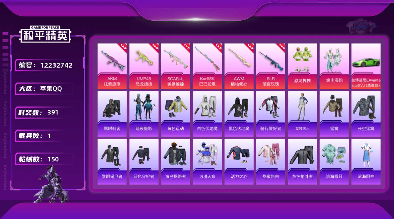 - [11819157]15粉装 15特效枪 1载具 6印记 可二次 可修改实名 身法装备:暗影哥特(红眼罩) 优质装备:玛莎拉蒂Quattroporte(夜幕蓝),M416五爪金龙,奇异狩猎者,梦幻火箭(新101)(新火箭少女101粉色套装),金属狂野,苍蓝魅影,AKM梦之光华,AUG超新星,SCAR-L-锦绣绵绵,M24镜域双华,PKM江南烟雨,七级AKM-梦之光华,Mk14精灵梦叶罗丽,Kar98K创世·救赎,UMP45-宇宙意志,SCAR-L-时空协奏,未来领航者,DP-28-千金淑猫,千金淑猫,GROZA-镜光银凌,SVD-月影灵韵,月影灵韵,AUG-暖羊咩咩,Kar98K-巳巳如意 热门装扮:炙焰赤龙,飓风飞鹰,旋转彩虹,呆萌星弥,镜光幻境,圣堂之誓,电波星,星空武士,创世·救赎,激萌罗小黑,浪漫波比 六级特效枪:六级M416-五爪金龙 五级特效枪:五级Mk14-精灵梦叶罗丽,五级Kar98K-巳巳如意,五级AUG-暖羊咩咩,五级SCAR-L-锦绣绵绵 四级特效枪:四级DP-28-千金淑猫,四级GROZA-镜光银凌,四级SVD-月影灵韵,四级Kar98K-创世·救赎,四级AUG-超新星 三级特效枪:三级SCAR-L-时空协奏,三级UMP45-宇宙意志,三级M24-镜域双华 二级特效枪:二级PKM-江南烟雨 紫色装扮:田园牧歌,轻风白浪,SS22特训,SS23特训,SS21特训,SS31特训套装,六六大吉,冷焰舞者,千禧之恋,SS30特训套装,SS20特训,梦起落英,青春冒险家,潮流游乐家,SS15特训,暗夜傀儡,梨园星光,暴风机械师,SS16特训,星河入梦,星梦畅游,治愈之星,科技之星,SS14特训,萌趣颜团子,微雨春柳,暖风夏荷,飞驰魅影,音速流光,SS19特训,薰款战斗服,瑞龙福将,团圆交子,醒狮腾龙,SS17特训,SS18特训,长空猛禽,霓虹街区,缤纷果语,街头潮人,骑行爱好者,魅力单车,黄色名流,龟仙人,童心宝龙,冰河战士,龙魂突击队,蝶变,香桃花海,沙漠毒蛇,活力之心,夏日倾情,夏日音浪,战地菁英,绮丽涂鸦,白色伏地魔,福星高照,空岛之星,空投萌叽,竞技达人朋克,炫蓝之夏,牛气满满,狂沙舞者,粉日山川,小熊娃娃,雏菊兔兔,萝兰蝴蝶,SS29特训,湖畔霞光,星途旅人,白光莹,纯真浪花,热情海星,曼妙人鱼,SS28特训,迎夏光舞,听雨铃兰,火种守护者(套装-火种守