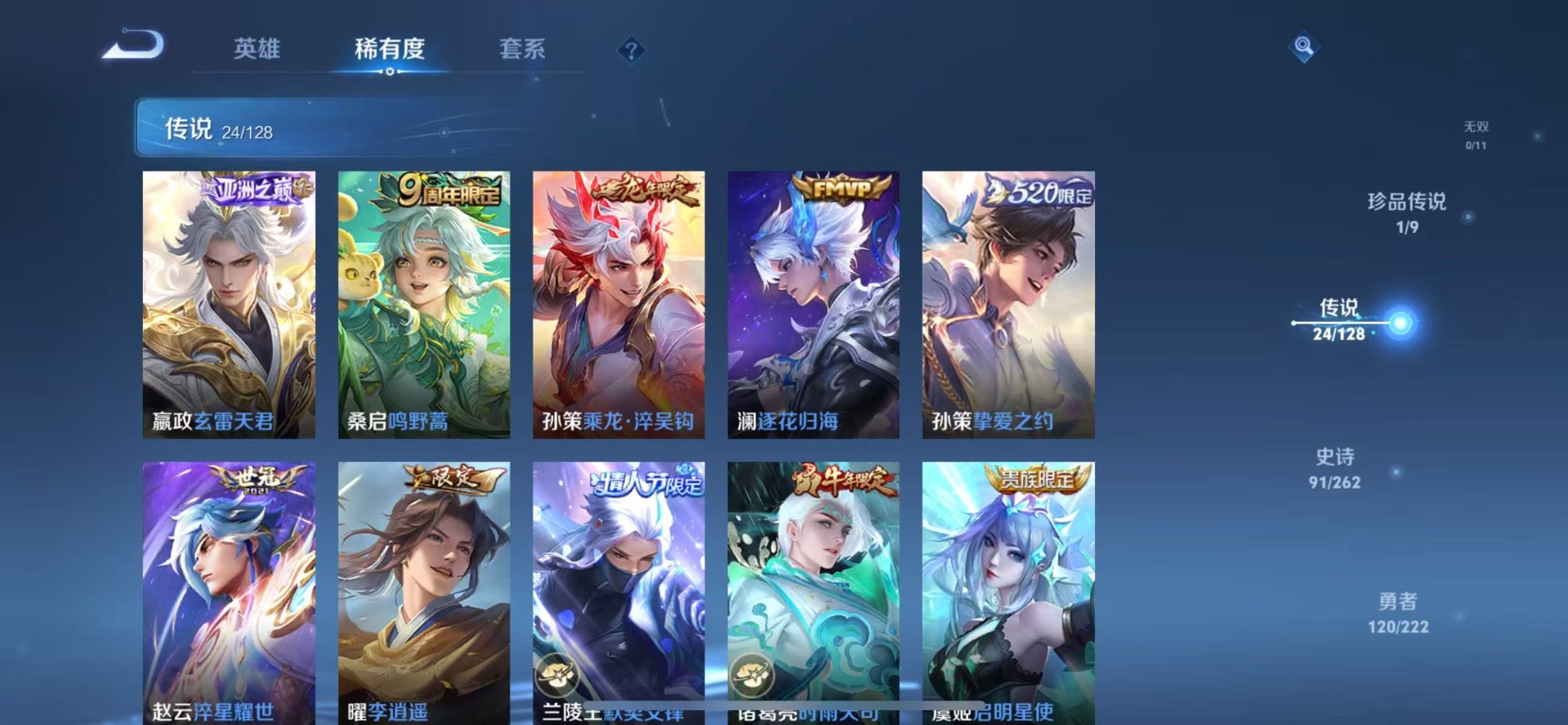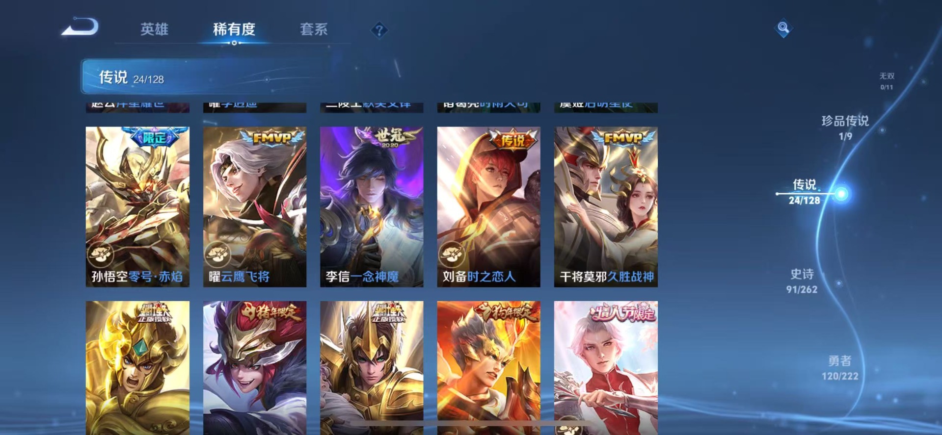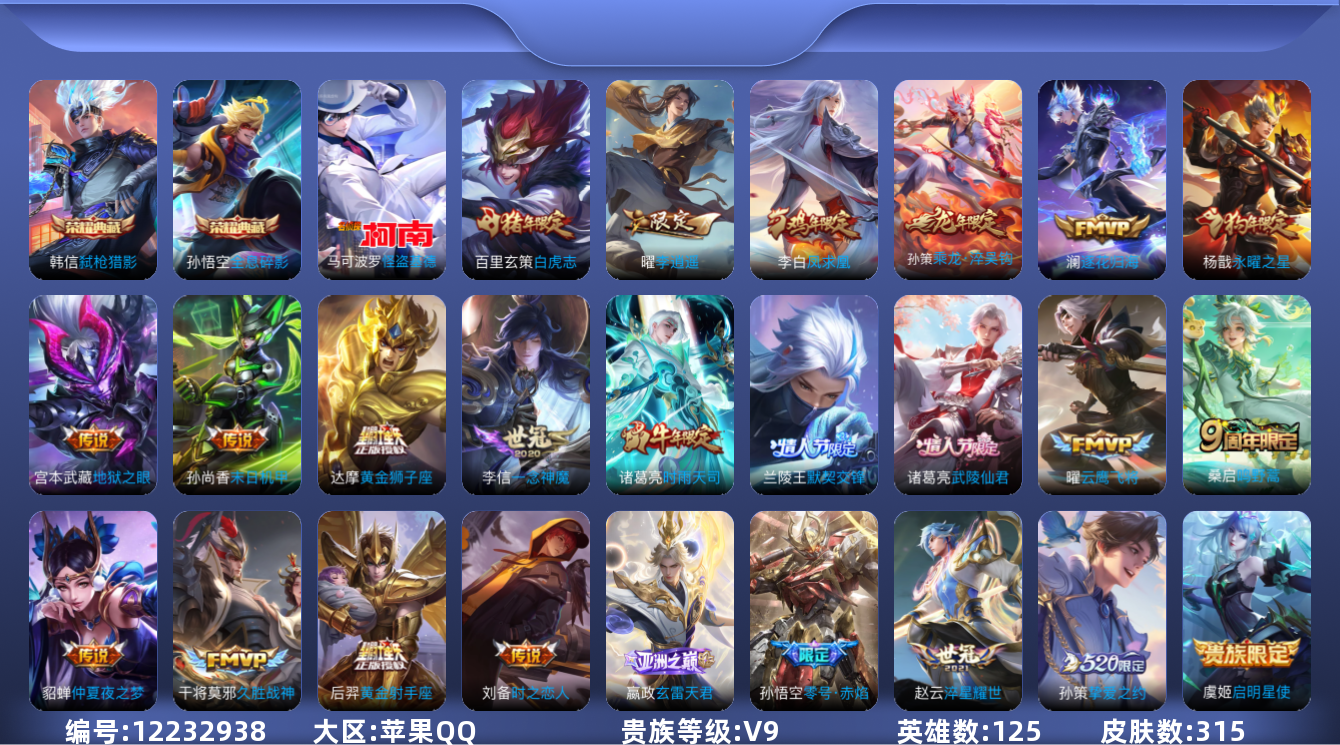[12232938]V9 2典藏 1珍品传说 24传说 125英雄 315皮肤 可修改实名 优质装备:全息碎影(猴子典藏),弑枪猎影(韩信典藏),怪盗基德,黄金狮子座,黄金射手座,云鹰飞将(小将军),久胜战神,一念神魔,末日机甲-孙尚香(绿蚂蚱),仲夏夜之梦(大飞蛾),零号·赤焰,地狱之眼,李逍遥,时之恋人-刘备(电焊工),淬星耀世,挚爱之约,澜逐花归海,玄雷天君 传说皮:乘龙·淬吴钩(孙策年限) 珍宝阁皮:优雅恋人,玩趣恶龙 限定皮:鸣野蒿,白虎志(电光耗子),凤求凰(白切鸡),凤凰于飞,武陵仙君(小桃花),时雨天司(水龙头),神威(电光马子),飞衡(韩信年限),高山流水,五谷丰年,青龙志(铠年限),游园惊梦,梁祝,岱宗(典韦年限),李小龙,逐梦之影,朱雀志(守约年限),永曜之星,默契交锋-兰陵王,默契交锋-花木兰,纯白花嫁,孙行者,猪悟能,一生所爱,大圣娶亲 史诗皮:紫霞仙子,电玩小子(小书包),白龙吟,黄金分割率,特工魅影,千年之狐,永昼,冰冠公主,江河有灵,百解令(蒙犽),魅语,无限星赏官,晚萤,偶像歌手,暗夜猫娘,末日机甲-吕布,猫狗日记-孙策,乱世虎臣,节奏热浪,修罗,女仆咖啡,摇滚巨星,水果甜心,绅士熊喵,天才门将,星夜王子,心灵骇客,功夫厨神,德古拉伯爵,暗隐猎兽者,幽灵船长,鬼剑武藏,暗渊魔法,心灵战警,舞动绿茵,地狱岩魂,纤云弄巧,繁星吟游(呼啦呼啦),拒霜思,缤纷独角兽,乘风破浪,逐浪之夏,水晶猎龙者,热力回旋,金属风暴,原初追逐者,圣诞狂欢,圣诞恋歌,鹰眼统帅,暗夜贵公子,魅力维加斯,黎明之约,赏金猎手,无心,未来纪元-赵云
