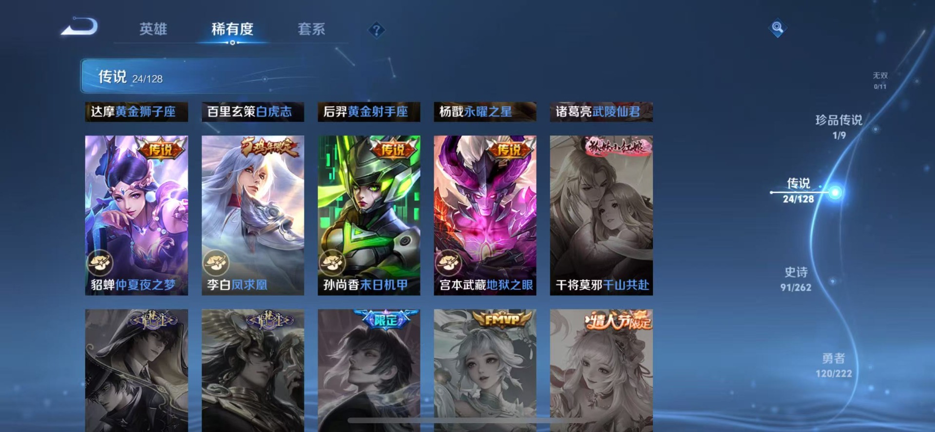 铠青龙志,小乔纯白花嫁,典韦岱宗,露娜一生所爱,诸葛亮时雨天司,兰陵王默契交锋,裴擒虎李小龙,上官婉儿梁祝,花木兰默契交锋,桑启鸣野蒿,猪八戒猪悟能,孙悟空孙行者,孙悟空大圣娶亲,百里玄策白虎志,马超神威,韩信飞衡,韩信逐梦之影,百里守约朱雀志,王昭君凤凰于飞