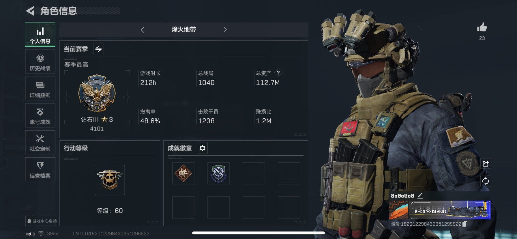 [12232984]总资产:112.7M 10传说枪械 哈夫币:65.237K 可二次 可修改实名 优质装备:顶级安全箱(3x3) 烽火地带段位:钻石 全面战场段位:上等兵 传说武器皮肤:UZI冲锋枪-特斯拉线圈,M16A4突击步枪-狩猎时刻,AK-12突击步枪-特斯拉线圈,SR-3M紧凑突击步枪-特斯拉线圈,勇士冲锋枪-能天使-午夜邮差,Vector冲锋枪-狩猎时刻,Vector冲锋枪-能天使-午夜邮差,G3战斗步枪-狩猎时刻,M4A1突击步枪-阿米娅,CAR-15突击步枪-阿米娅 史诗武器皮肤:AUG突击步枪-蝮蛇,PKM通用机枪-蝮蛇,M16A4突击步枪-竞赛选手,M1014霰弹枪-林中猎手,MP5冲锋枪-深海恐惧,AKM突击步枪-林中猎手,QJB201轻机枪-Old Habits,SCAR-H战斗步枪-囚徒