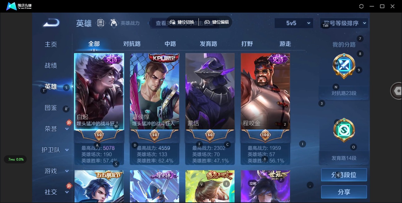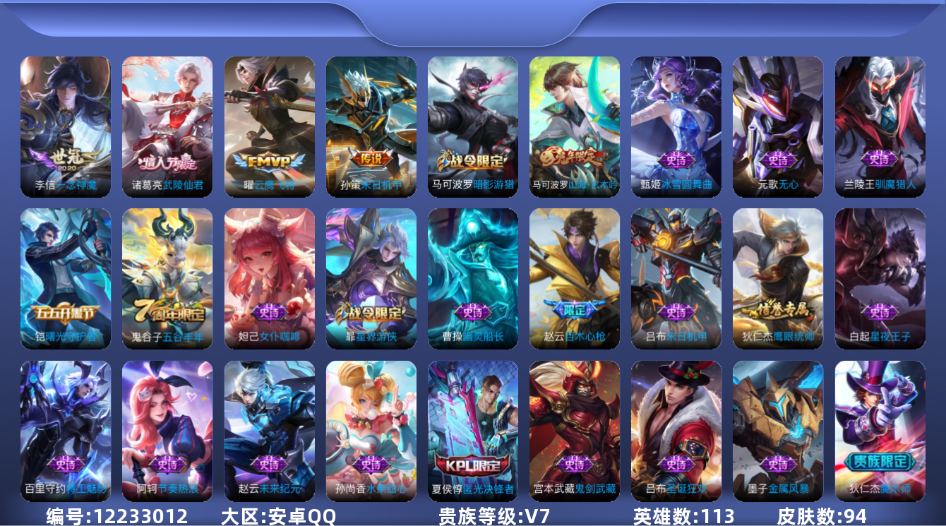 [12233012]V7 4传说 113英雄 94皮肤 可修改实名 优质装备:云鹰飞将(小将军),一念神魔,末日机甲-孙策 珍宝阁皮:胡桃夹子 限定皮:武陵仙君(小桃花),匿光决锋者,五谷丰年,百木心枪,山海·玄木吟(马可年限) 史诗皮:特工魅影,百解令(蒙犽),末日机甲-吕布,节奏热浪,女仆咖啡,水果甜心,绅士熊喵,星夜王子,功夫厨神,幽灵船长,鬼剑武藏,地狱岩魂,逐浪之夏,曙光守护者,金属风暴,圣诞狂欢,鹰眼统帅,无心,未来纪元-赵云