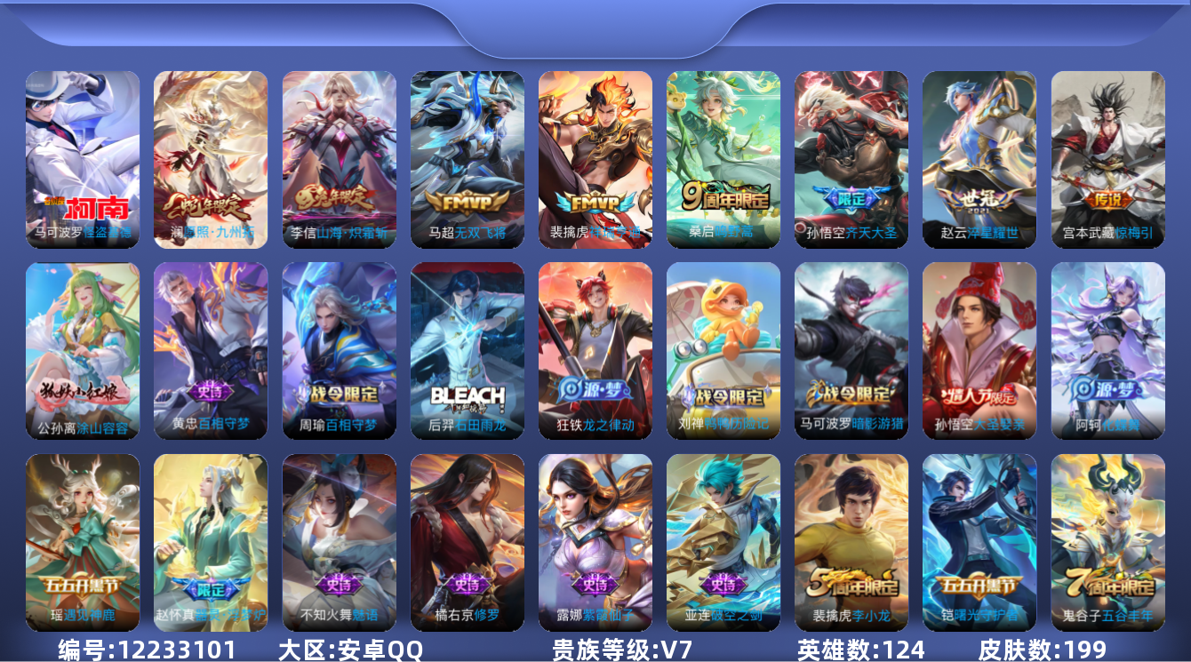 [12233101]V7 1珍品传说 8传说 124英雄 199皮肤 可修改实名 优质装备:怪盗基德,淬星耀世,无双飞将,山海·炽霜斩(李信年限),惊梅引,涂山容容 传说皮:祥瑞亨通 珍宝阁皮:胡桃夹子,蔷薇恋人 限定皮:愿照·九州拓(澜年限),逐霄战戟,鸣野蒿,齐天大圣,五谷丰年,李小龙,大圣娶亲,百木心枪 史诗皮:鸭鸭历险记-刘禅,器灵·浮梦炉,绮世丹青,化蝶舞,龙之律动,石田雨龙,百相守梦-周瑜,茶境仙,百相守梦-黄忠,破空之剑,百相守梦-百里守约,遇见神鹿,紫霞仙子,特工魅影,千年之狐,冰冠公主,魅语,猫狗日记-孙策,乱世虎臣,节奏热浪,修罗,女仆咖啡,水果甜心,星夜王子,功夫厨神,暗隐猎兽者,幽灵船长,鬼剑武藏,天秀·启明,纤云弄巧,拒霜思,缤纷独角兽,乘风破浪,逐浪之夏,水晶猎龙者,曙光守护者,箭羽风息,唤灵魅影,圣诞狂欢,鹰眼统帅,魅力维加斯,黎明之约