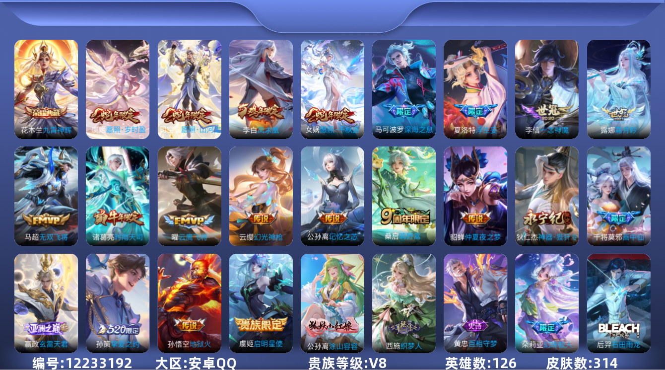 [12233192]V8 1典藏 21传说 126英雄 314皮肤 可修改实名 优质装备:九霄神辉(木兰典藏),云鹰飞将(小将军),一念神魔,地狱火,仲夏夜之梦(大飞蛾),挚爱之约,无双飞将,神器·狴犴令,画中仙,浮生妄,记忆之芯(机甲兔),霜月吟,玄雷天君,涂山容容 传说皮:幻光神枪 珍宝阁皮:妄想食味,胡桃夹子,优雅恋人,蔷薇恋人,玩趣恶龙 限定皮:愿照·岁时盈(虞姬年限),愿照·山河定(司空震年限),愿照·千秋盛(女娲年限),鸣野蒿,至尊宝,凤求凰(白切鸡),时雨天司(水龙头),飞衡(韩信年限),匿光决锋者,五谷丰年,青龙志(铠年限),冰锋战神,游园惊梦,梁祝,御风骁将(吕布年限),天狼溯光者,天狼绘梦者,李小龙,逐梦之光,如梦令-后羿,深海之息(深海大菠萝),山海·玄木吟(马可年限) 史诗皮:灵蛊蚀心,星界战将,石田雨龙,百相守梦-黄忠,涂山红红,蔬乡物语(鲁班七号),幻珠鲛人,织梦人,紫霞仙子,黄金分割率,特工魅影,千年之狐,冰冠公主,末日机甲-莱西奥,匿光侦查者,江河有灵,百解令(蒙犽),高渐离燃音魔法,蒙恬荣光圣徽,魅语,电玩·爆裂旋风,晚萤,偶像歌手,银翎春语,龙骑士(小龙虾),暗夜猫娘,末日机甲-吕布,猫狗日记-孙策,猫狗日记-大乔,时之恋人-孙尚香,乱世虎臣,节奏热浪,修罗,女仆咖啡,摇滚巨星,水果甜心,天才门将,星夜王子,心灵骇客,功夫厨神,德古拉伯爵,暗隐猎兽者,幽灵船长,鬼剑武藏,心灵战警,舞动绿茵,地狱岩魂,纤云弄巧,繁星吟游(呼啦呼啦),拒霜思,缤纷独角兽,乘风破浪,逐浪之夏,月团寄思,水晶猎龙者,箭羽风息,金属风暴,圣诞恋歌,鹰眼统帅,暗夜贵公子,无心,未来纪元-赵云