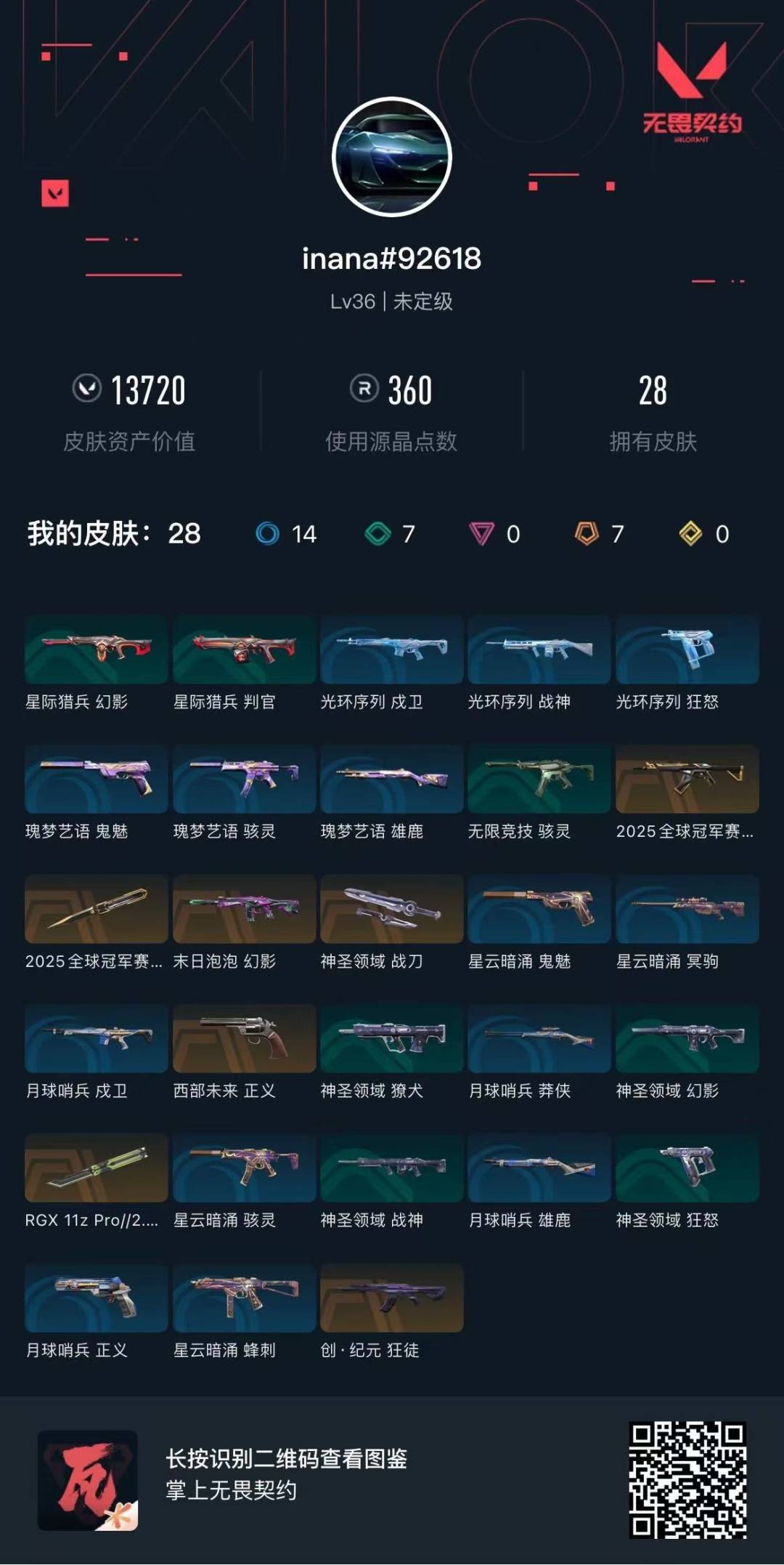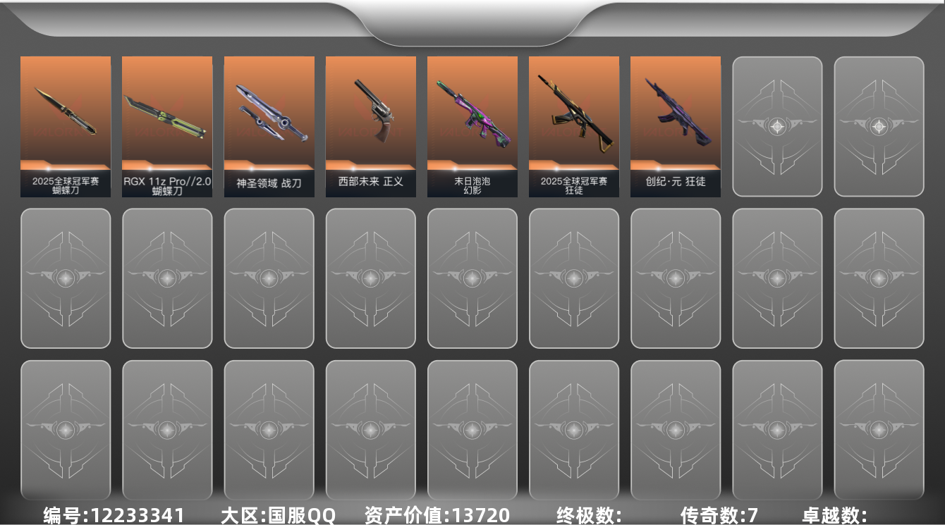 [12233341]7橙皮 28皮肤 13英雄 43卡面 360已用源晶 未定级 优质装备:2025全球冠军赛 蝴蝶刀,神圣领域 战刀,RGX 11z Pro//2.0 蝴蝶刀,幻影-末日泡泡,2025全球冠军赛 狂徒 佩枪皮肤:正义-西部未来 步枪皮肤:狂徒-创·纪元