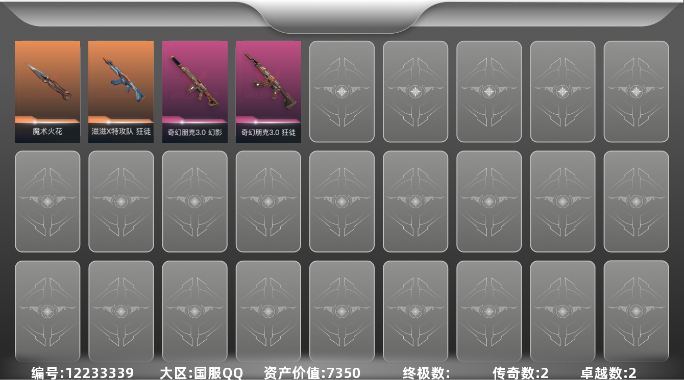 [12233339]2橙皮 2紫皮 6皮肤 12英雄 19卡面 205已用源晶 青铜 优质装备:魔术火花 步枪皮肤:奇幻朋克3.0狂徒,幻影-奇幻朋克3.0,狂徒-滋滋X特攻队