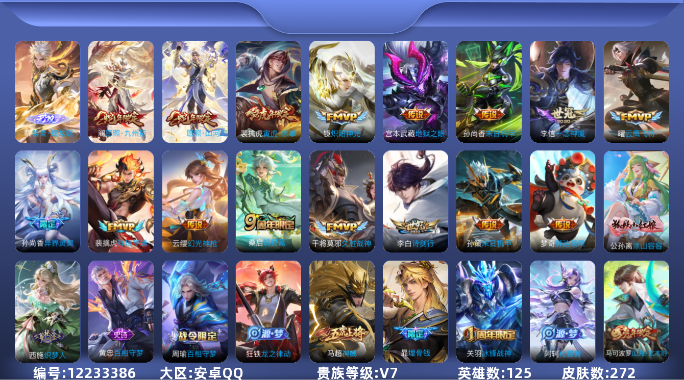 [12233386]V7 1无双 16传说 125英雄 272皮肤 可修改实名 刘备小国标 优质装备:器灵·螭龙剑,云鹰飞将(小将军),久胜战神,炽阳神光,一念神魔,末日机甲-孙尚香(绿蚂蚱),地狱之眼,胖达荣荣,末日机甲-孙策,涂山容容 传说皮:祥瑞亨通,幻光神枪 珍宝阁皮:优雅恋人,玩趣恶龙 限定皮:愿照·九州拓(澜年限),愿照·山河定(司空震年限),逐霄战戟,鸣野蒿,异界灵契(白毛香),傲雪梅枪,神威(电光马子),遇见飞天,高山流水,诗剑行,五谷丰年,冰锋战神,游园惊梦,梁祝,天狼狩猎者,李小龙,匿光追影者,寅虎·赤拳(老虎年限),山海·玄木吟(马可年限) 史诗皮:器灵·浮梦炉,化蝶舞,龙之律动,星界战将,百相守梦-周瑜,百相守梦-黄忠,埋骨钱,百相守梦-百里守约,织梦人,苍穹之光,黄金分割率,特工魅影,千年之狐,永昼,冰冠公主,江河有灵,百解令(蒙犽),蒙恬荣光圣徽,魅语,无限星赏官,晚萤,匿光破解者,龙骑士(小龙虾),暗夜猫娘,末日机甲-吕布,猫狗日记-孙策,乱世虎臣,节奏热浪,修罗,女仆咖啡,摇滚巨星,水果甜心,星夜王子,心灵骇客,功夫厨神,德古拉伯爵,暗隐猎兽者,幽灵船长,鬼剑武藏,舞动绿茵,地狱岩魂,纤云弄巧,拒霜思,缤纷独角兽,乘风破浪,逐浪之夏,水晶猎龙者,原初追逐者,圣诞恋歌,鹰眼统帅,暗夜贵公子,魅力维加斯,黎明之约,无心,未来纪元-赵云