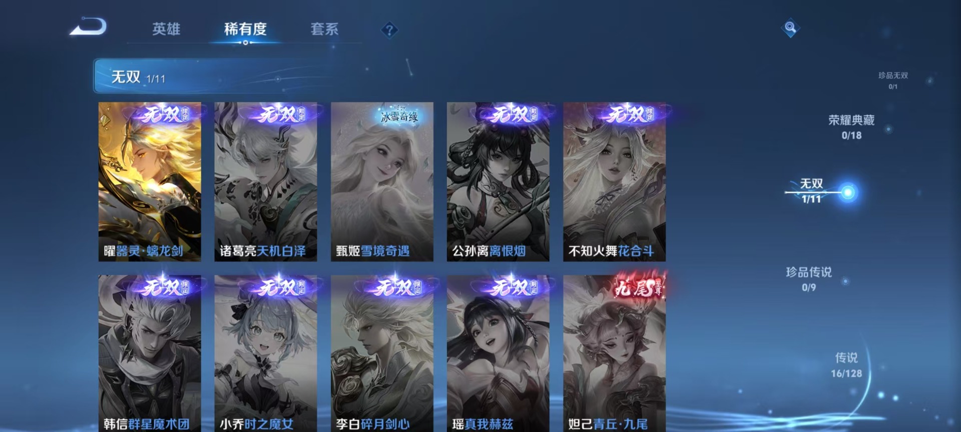孙尚香异界灵契,镜匿光追影者,司空震愿照·山河定,裴擒虎李小龙,裴擒虎天狼狩猎者,裴擒虎寅虎·赤拳,上官婉儿梁祝,李白诗剑行,马可波罗山海·玄木吟,桑启鸣野蒿,马超神威,韩信傲雪梅枪,澜愿照·九州拓,关羽冰锋战神