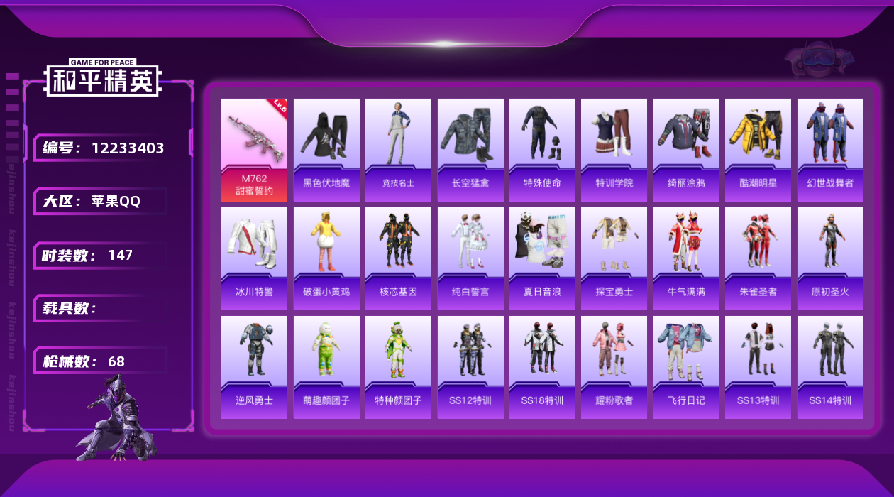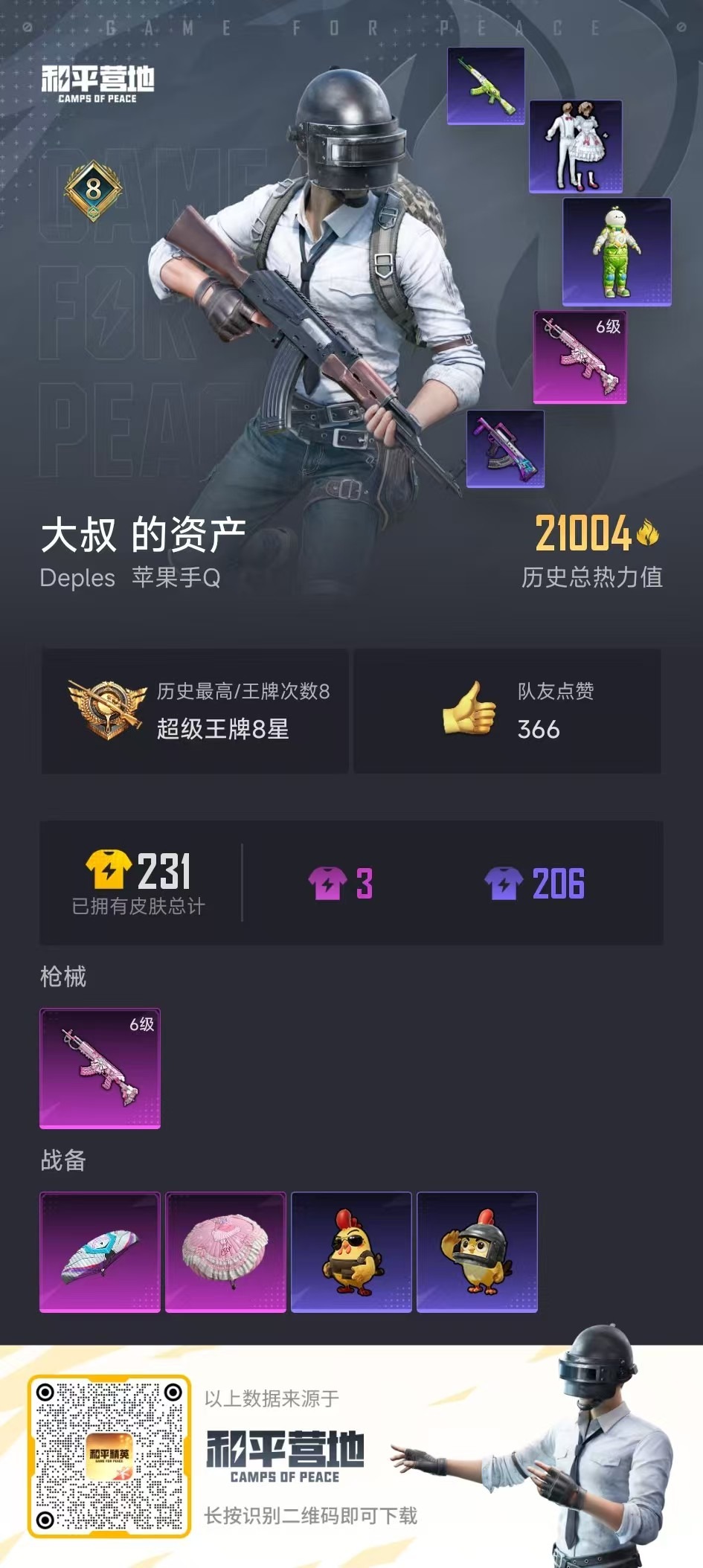 - PX_2097079- 可二次 苹果手Q-7王牌印记-2粉装-5特效枪-0载具-29811热力值-80套装-97枪皮-3卓越印记-1传奇印记, 【2粉装】,天使彩虹糖,冷漠罗丽, 【5特效枪】,SCAR-L-锦绣绵绵-5级,M416-电玩时刻-5级,GROZA-镜光银凌-5级,Kar98K-巳巳如意-4级,UMP45-量子极限-5级, 【5稀有紫装】,都市猎人,Mark.06,浪漫天命,小丑鱼,龟