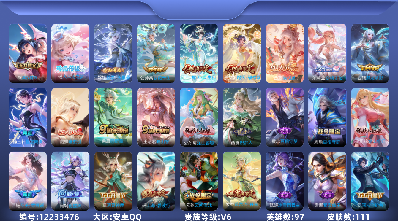 - [9806152]实名: 可修改 性别: 男号 贵族等级: V6 英雄数: 123 皮肤数: 110 珍品传说: 怪盗基德,器灵·落星盏 传说皮: 霜月吟,乘龙·淬吴钩 限定皮: 大圣娶亲,五谷丰年,鸣野蒿,愿照·山河定,愿照·九州拓