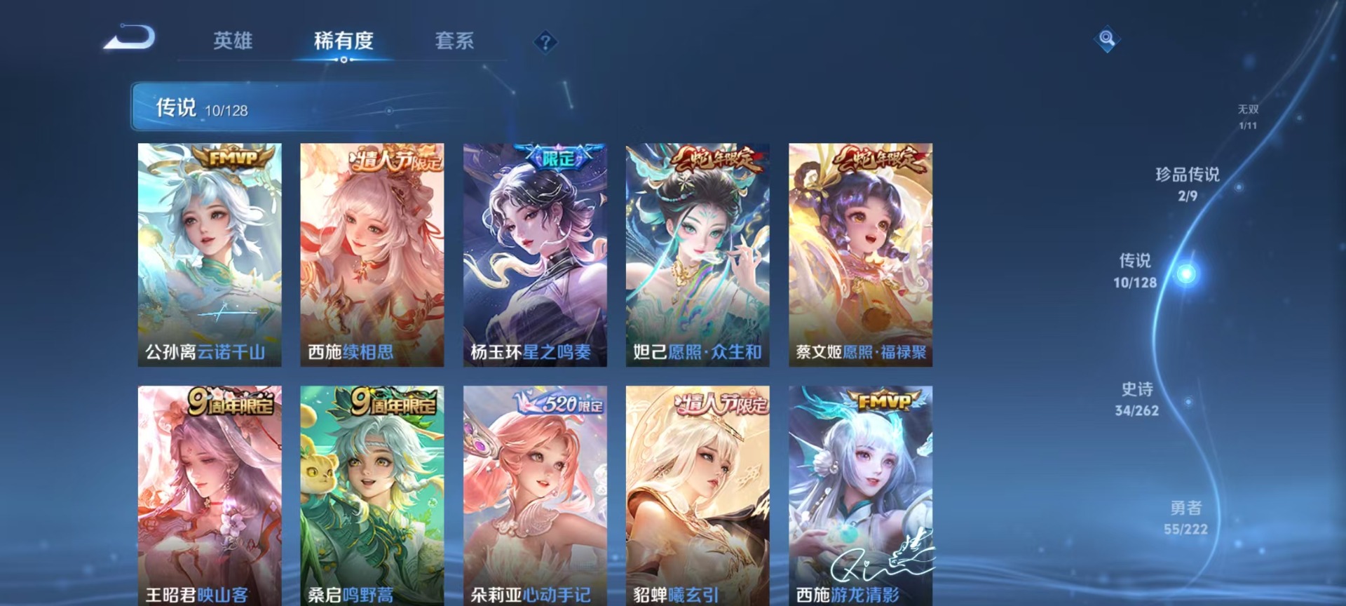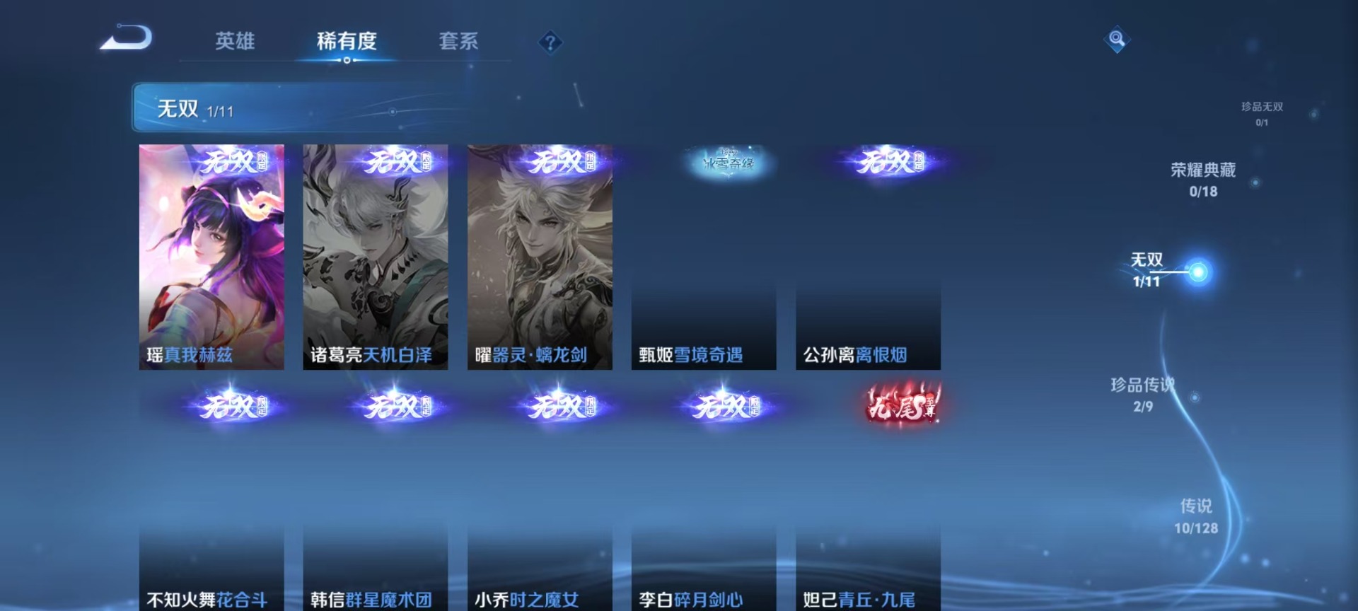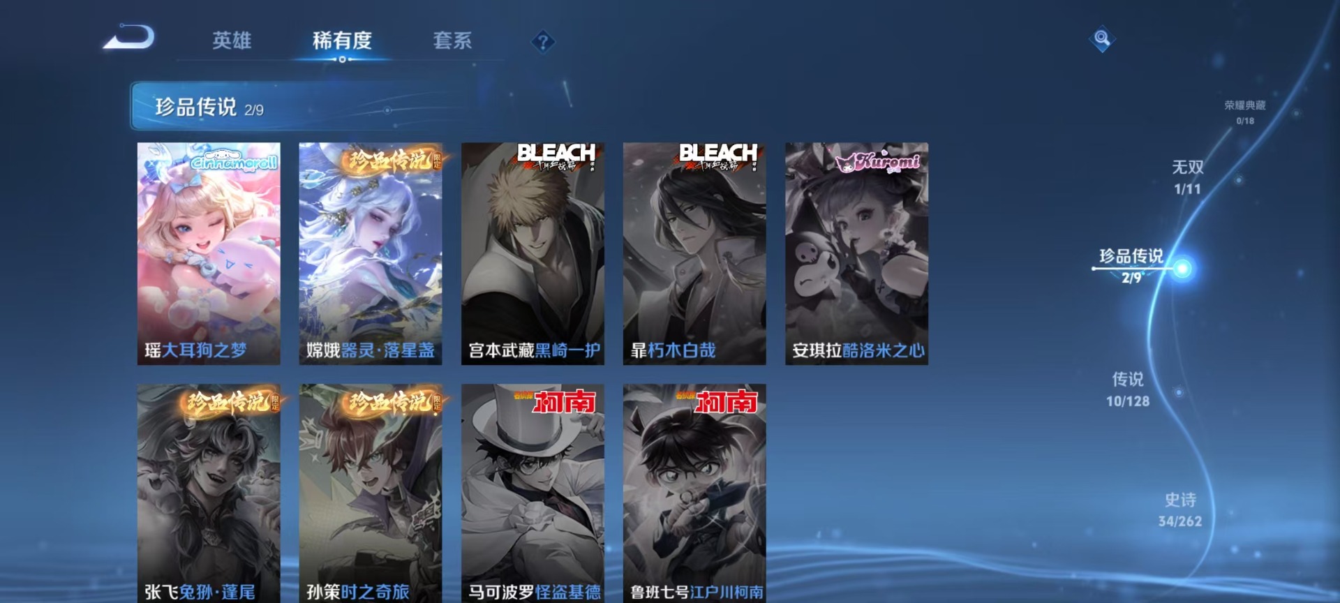 - PX_2089030- 可二次 V9 贵族积分120642 安卓QQ/355皮肤/125英雄/2典藏/0珍品无双/1无双/4珍品传说/39传说/98史诗/9稀有英雄 发育路33段 打野44段 历史(省标曜 ) 【3 星传说皮肤】,幽冥火 孙悟空,幽冥之眼 宫本武藏,星际治安官 狄仁杰, 【4 珍品传说】,朽木白哉 暃,黑崎一护 宫本武藏,时之奇旅 孙策,器灵·落星盏 嫦娥, 【2 典藏皮肤】,弑