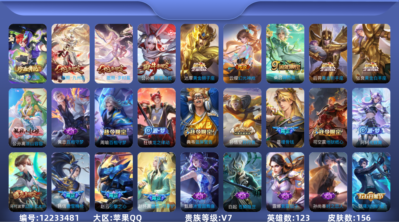 [12233481]V7 1珍品传说 8传说 123英雄 156皮肤 可修改实名 优质装备:黄金狮子座,黄金射手座,黄金白羊座,涂山容容 珍品传说:时之奇旅-孙策 传说皮:幻光神枪 限定皮:愿照·九州拓(澜年限),愿照·岁时盈(虞姬年限),鸣野蒿,傲雪梅枪,祈雪灵祝(雪兔子),孙行者,引擎之心,山海·玄木吟(马可年限) 史诗皮:苍鳞隐世,器灵·浮梦炉,绮世丹青,化蝶舞,龙之律动,百相守梦-周瑜,茶境仙,埋骨钱,蔬乡物语(鲁班七号),百相守梦-黄忠,紫霞仙子,千年之狐,末日机甲-吕布,时之恋人-孙尚香,乱世虎臣,节奏热浪,女仆咖啡,摇滚巨星,水果甜心,心灵骇客,暗隐猎兽者,幽灵船长,鬼剑武藏,舞动绿茵,地狱岩魂,曙光守护者,箭羽风息,金属风暴,圣诞恋歌,鹰眼统帅,魅力维加斯,未来纪元-赵云